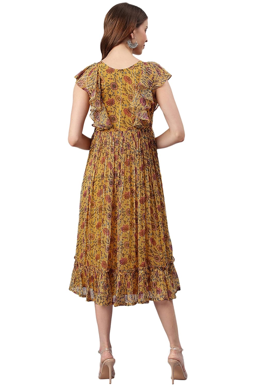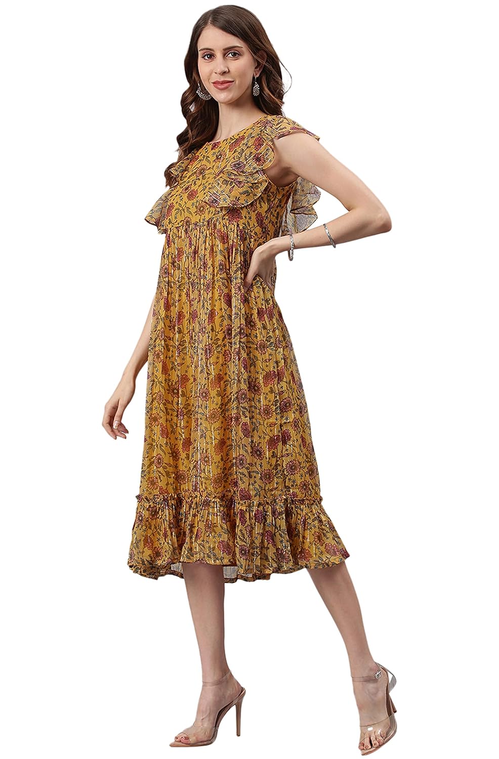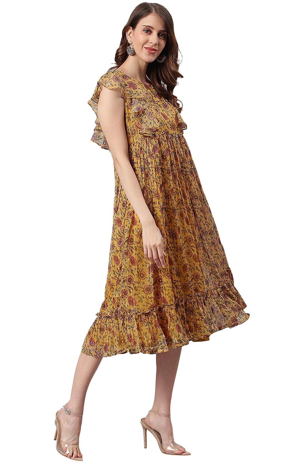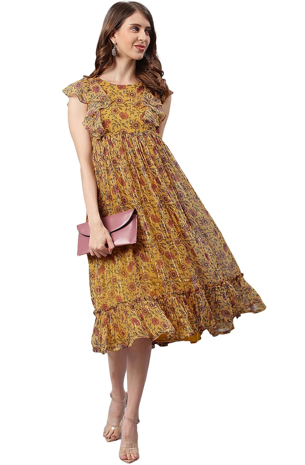 Premium Collection by Janasya. Replace some of your outdated essentials with this beautiful dress from Janasya. Made from soft poly georgette this dress has ruffle added on princess line with gathers on empire line and hemline to add the flare on this crepe lined piece. Adding charm on this floral print comes lurex design over-all. Wear your printed mustard piece with strappy heels and your favourite clutch for a night out on the town with your friends.