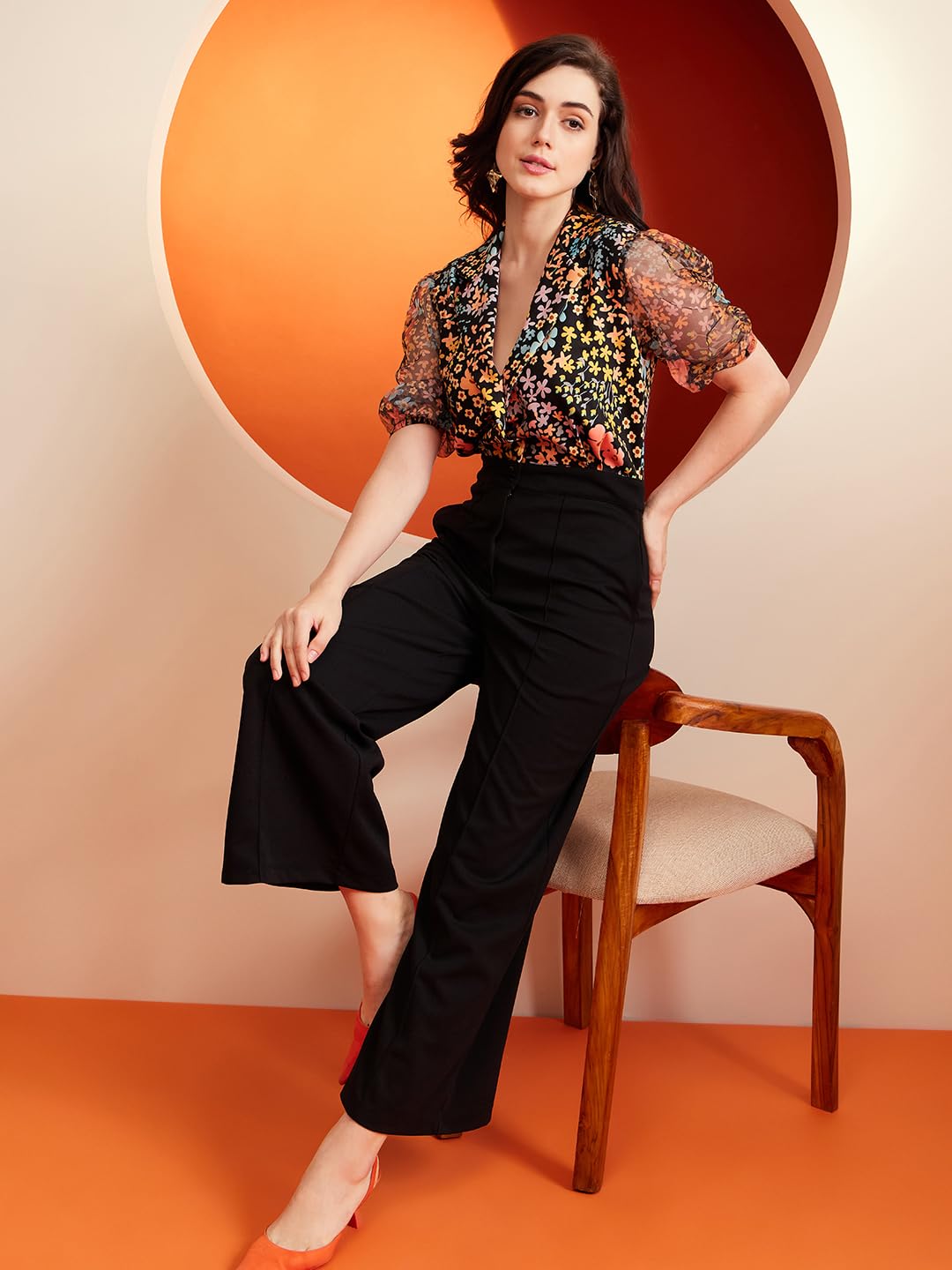 Kassually jumpsuits for women Notch Lapel Collar Puff Sleeve Printed Jumpsuit