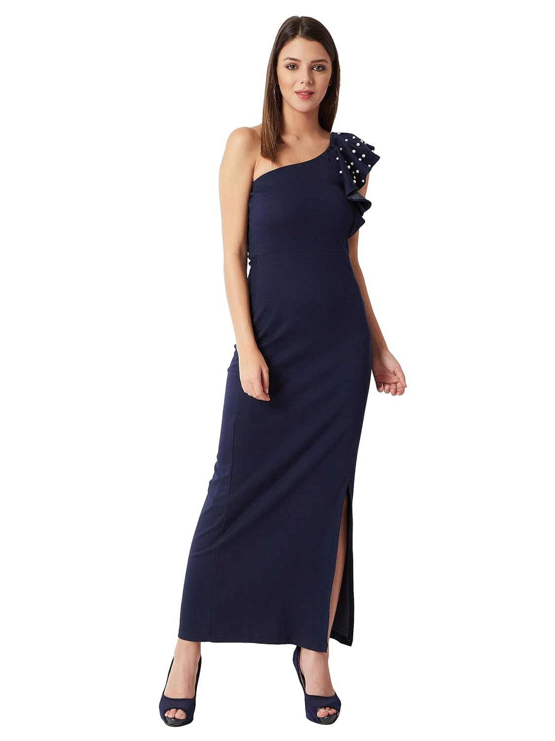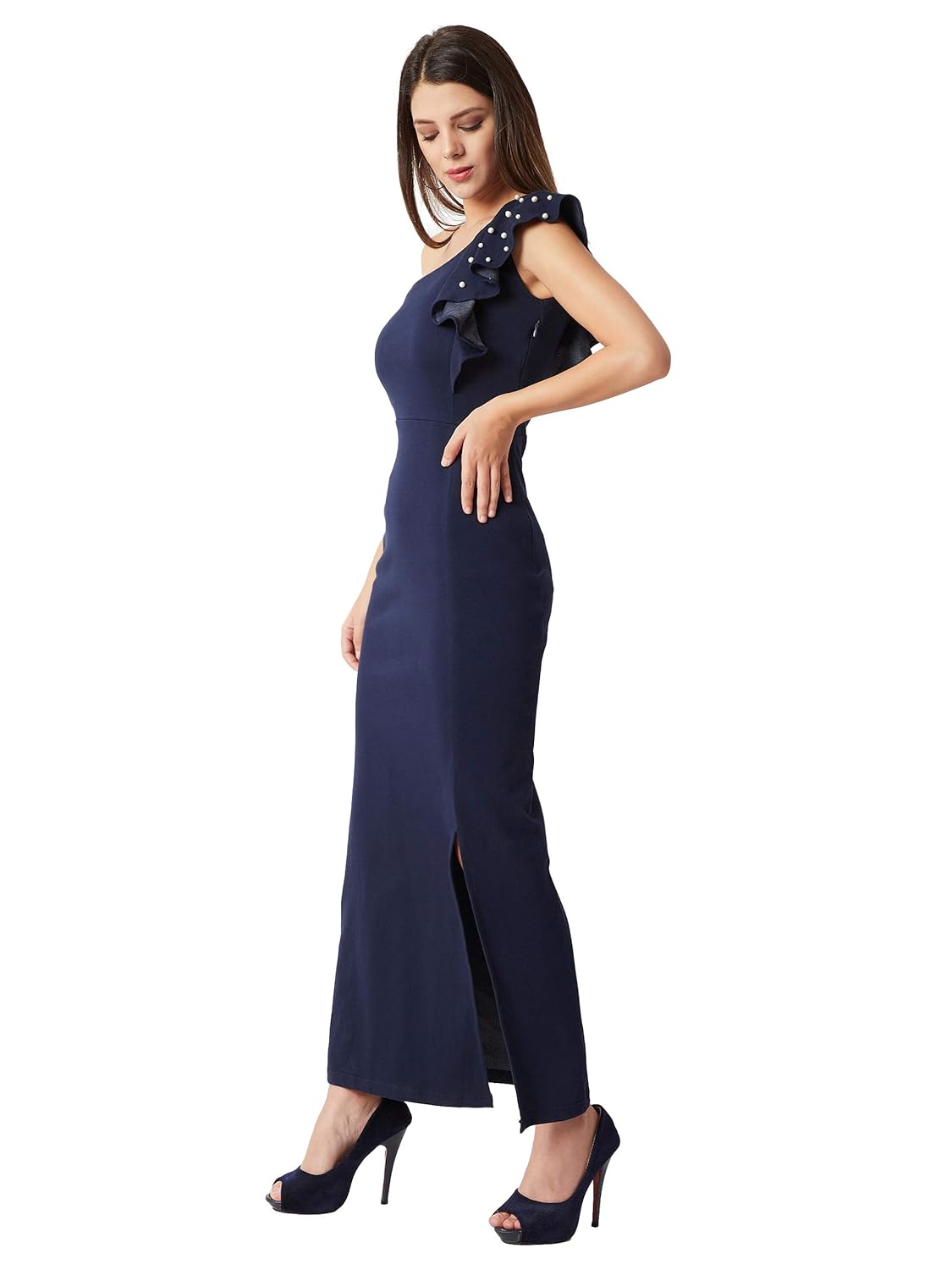 Navy blue knitted cotton solid ruffled pearl and slit detailing one shoulder maxi bodycon dress, Is sleeveless and embellished, Has a zip closure