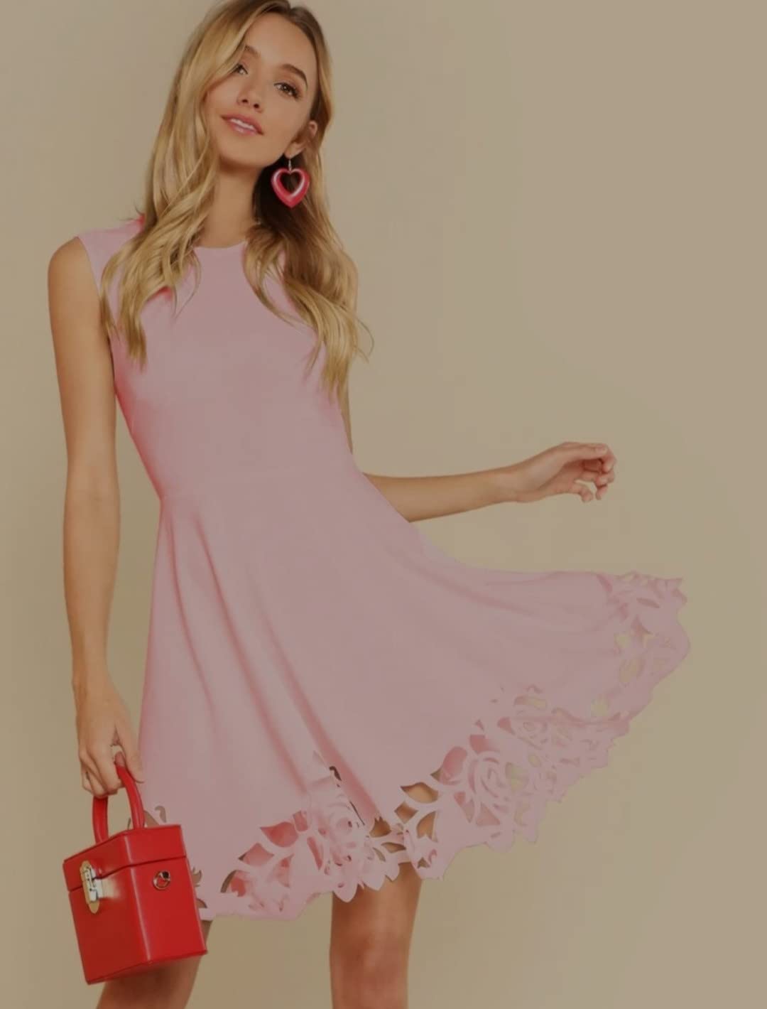 MOONEY Women’s Polyester Blend Laser Cut Fit and Flare Dress (Pink) (DRES031)