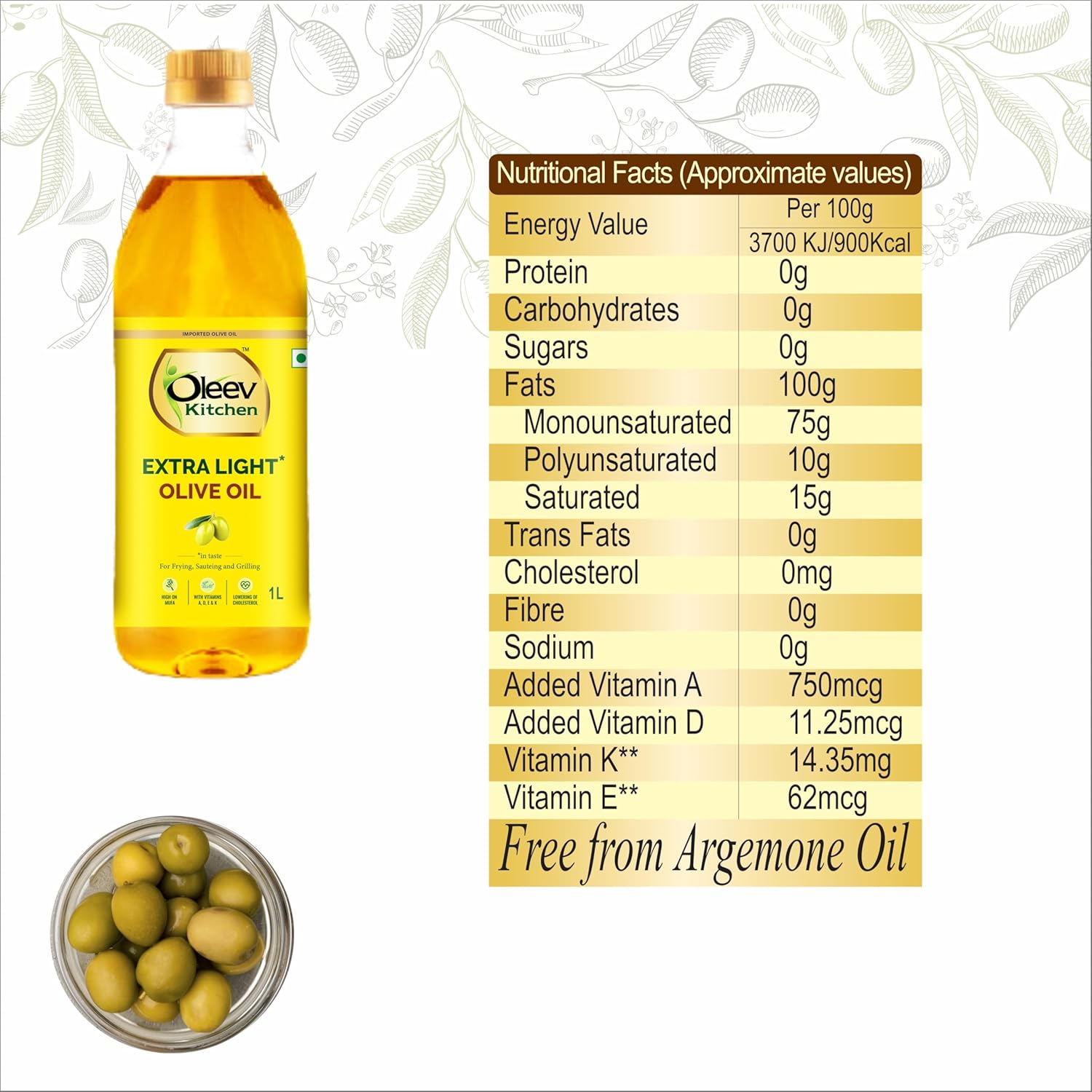Oleev extra Light olive oil is made with select olives and processed in a scientifically-advanced environment. Ideal for sautéing and grilling, it is a healthy alternative to other regular edible oils. Oleev extra Light olive oil is a rich source of essential nutrients and energy which helps you stay healthy and active. Go for a healthier alternative, live up to your ambitions and get ready to go beyond.