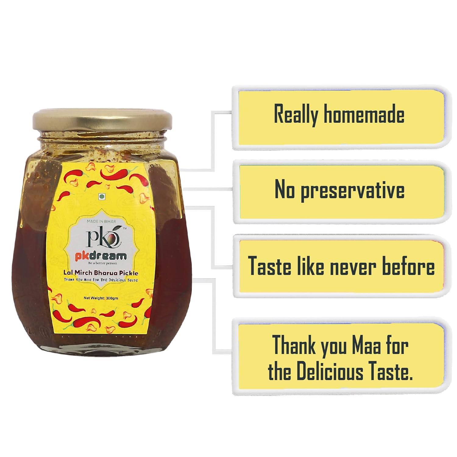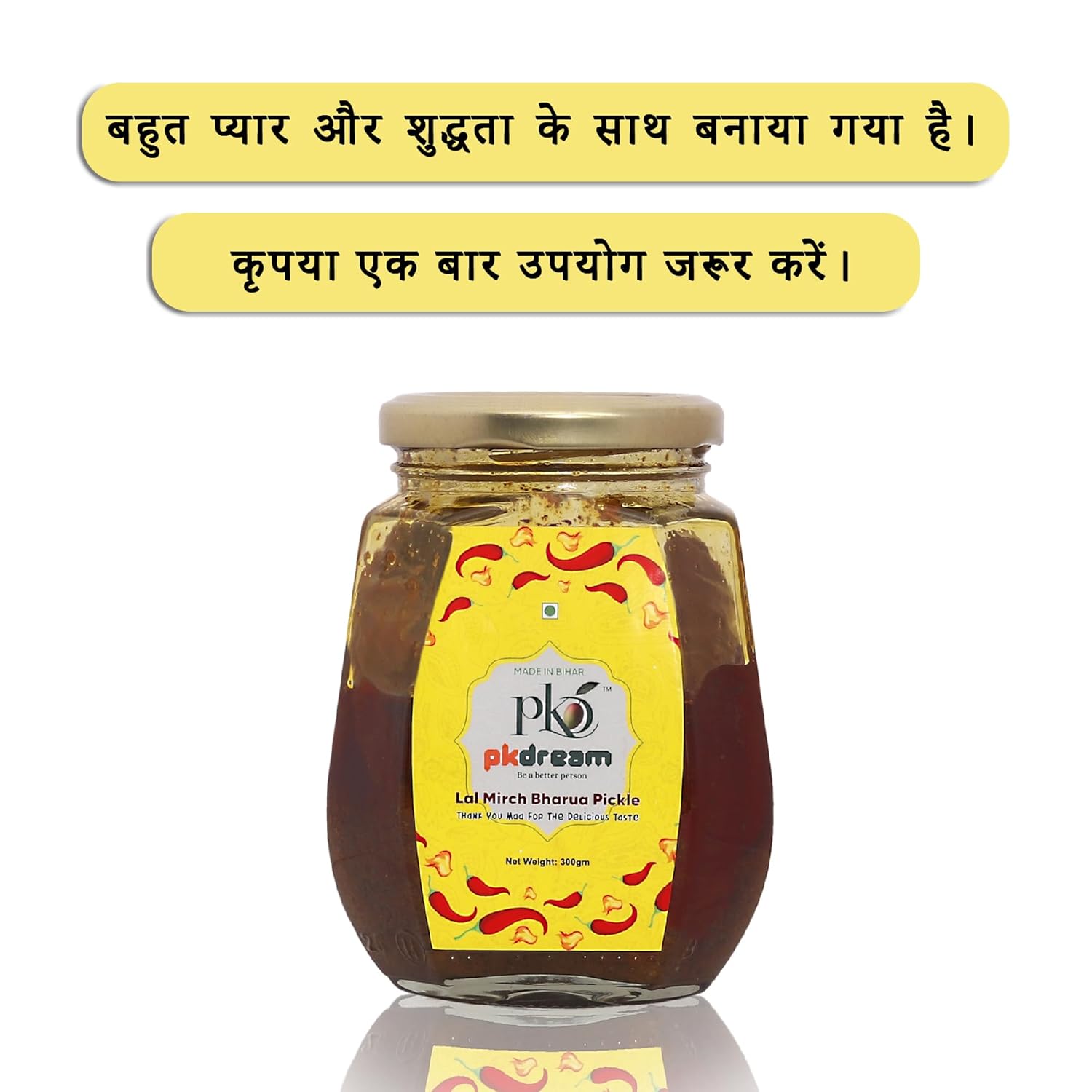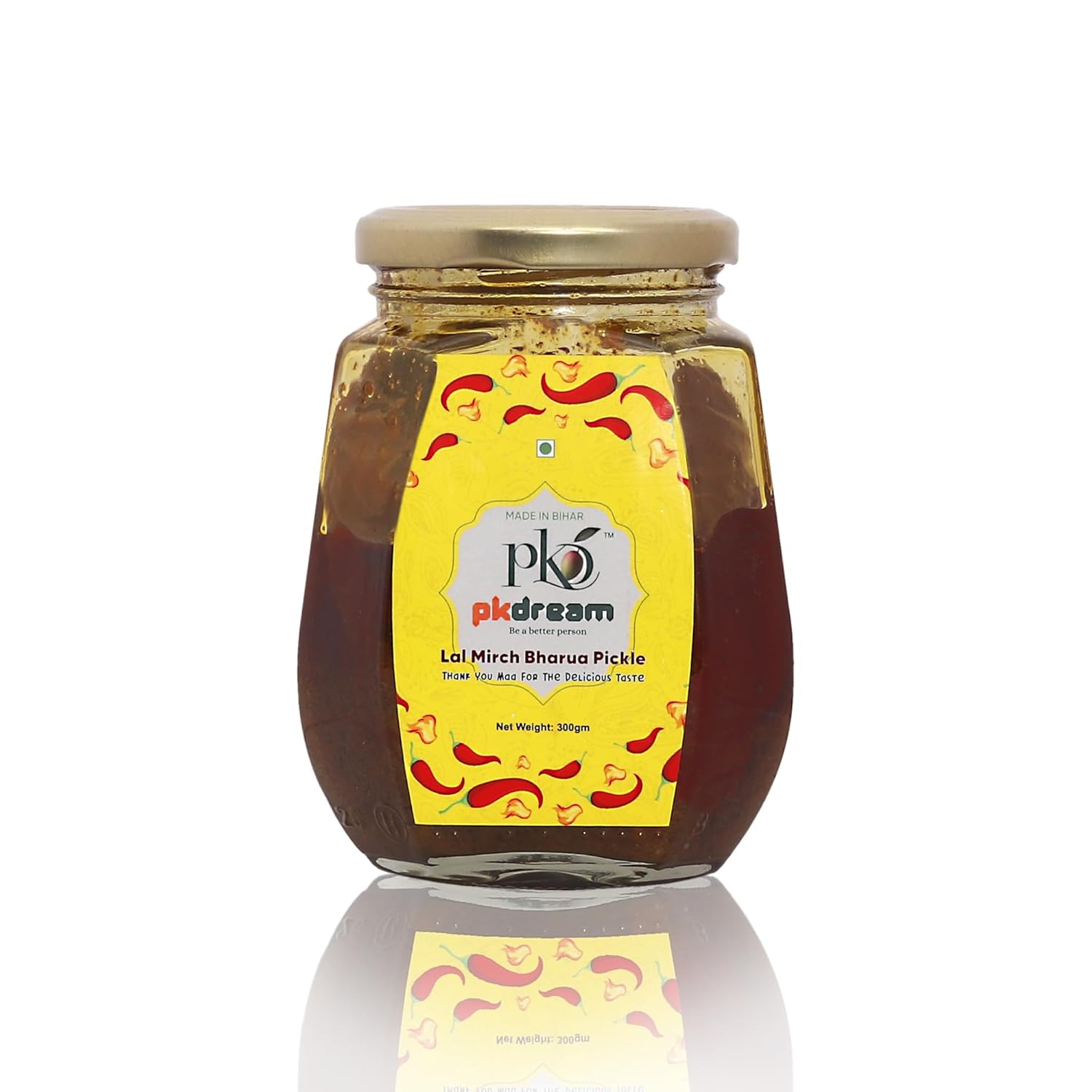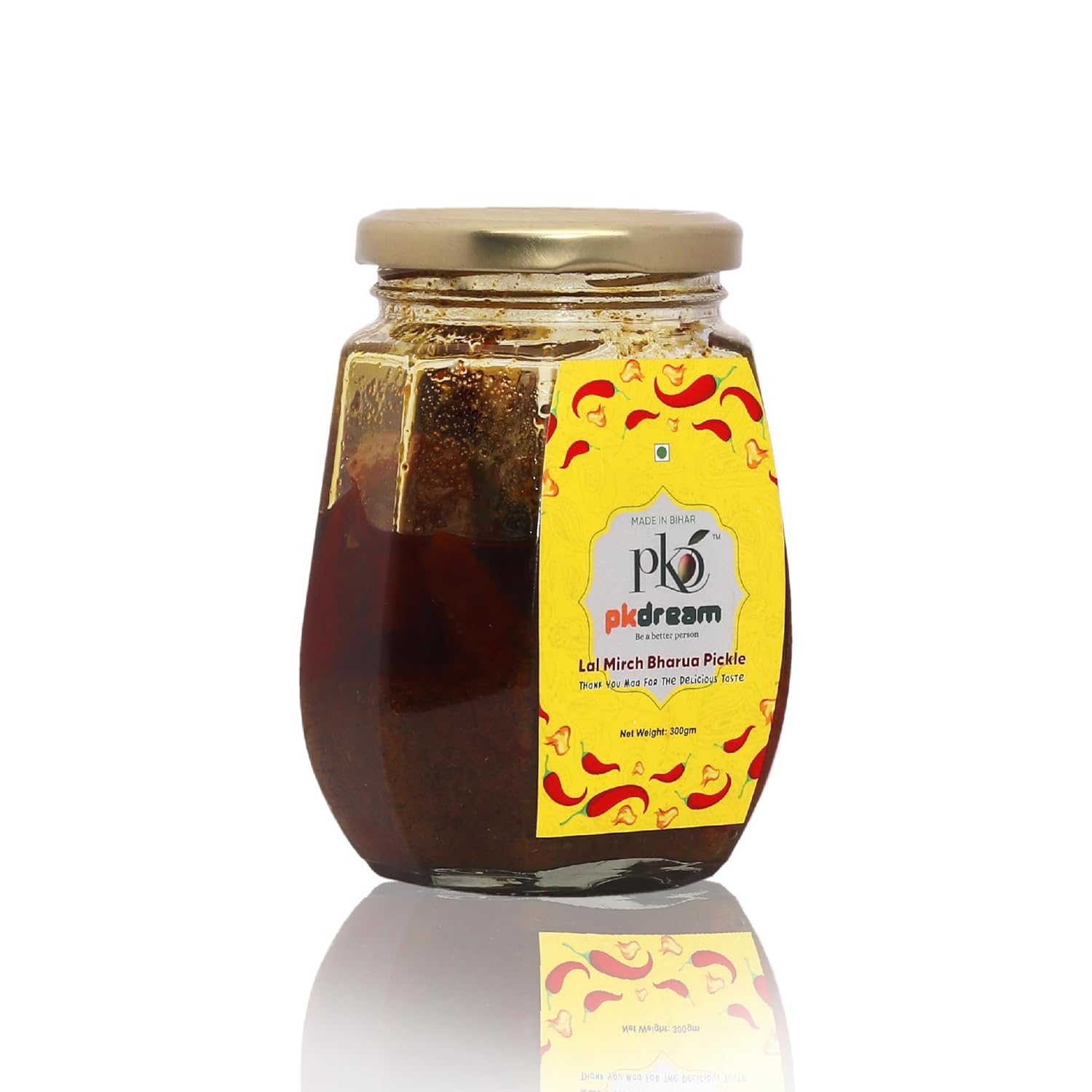 PKDream’s Lal Bharua Mirch Pickle is a fiery, flavorful delight made with authentic Bihari-style recipes. Handcrafted with care, this pickle uses sun-dried red chilies stuffed with aromatic spices and prepared in mustard oil to deliver a bold, tangy, and spicy taste. Completely natural and free from preservatives or artificial colors, it’s a healthy choice for enhancing any meal. Perfect for spice lovers, this pickle pairs beautifully with parathas, rice, or snacks, adding a punch of flavor to every bite. Packed in a 300 gm jar, PKDream Lal Bharua Mirch Pickle is a must-try for an unforgettable taste experience.