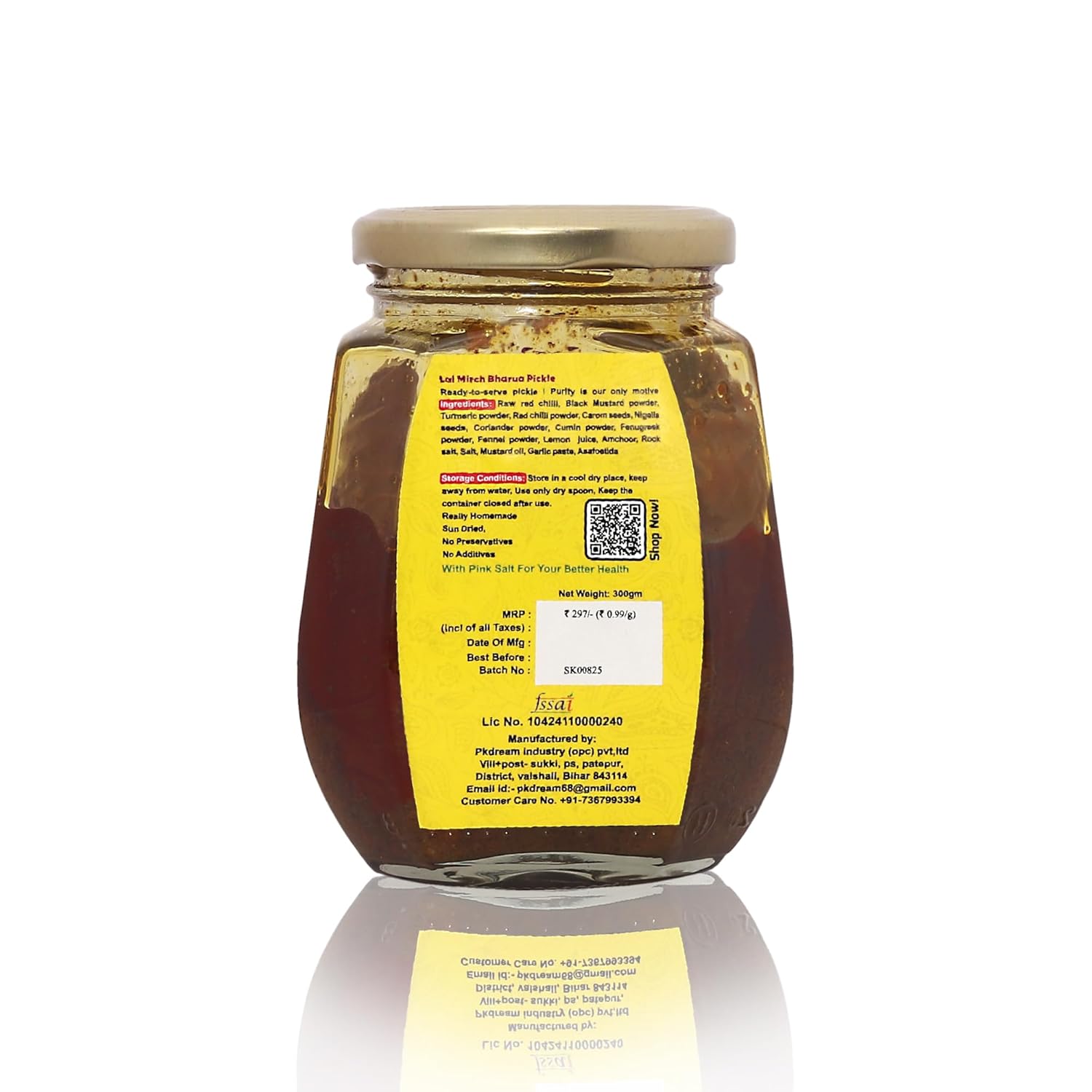 PKDream’s Lal Bharua Mirch Pickle is made in authentic Bihari style, using a traditional recipe for bold, tangy, and spicy flavors. This handcrafted delicacy features sun-dried red chilies stuffed with aromatic spices, ensuring enhanced taste and texture. Prepared with the goodness of mustard oil, it delivers a rich aroma while acting as a natural preservative. Completely pure and natural, it is free from preservatives and artificial colors, making it a healthy choice.