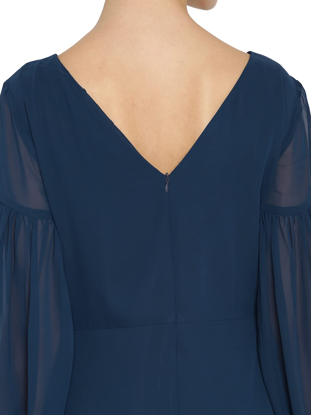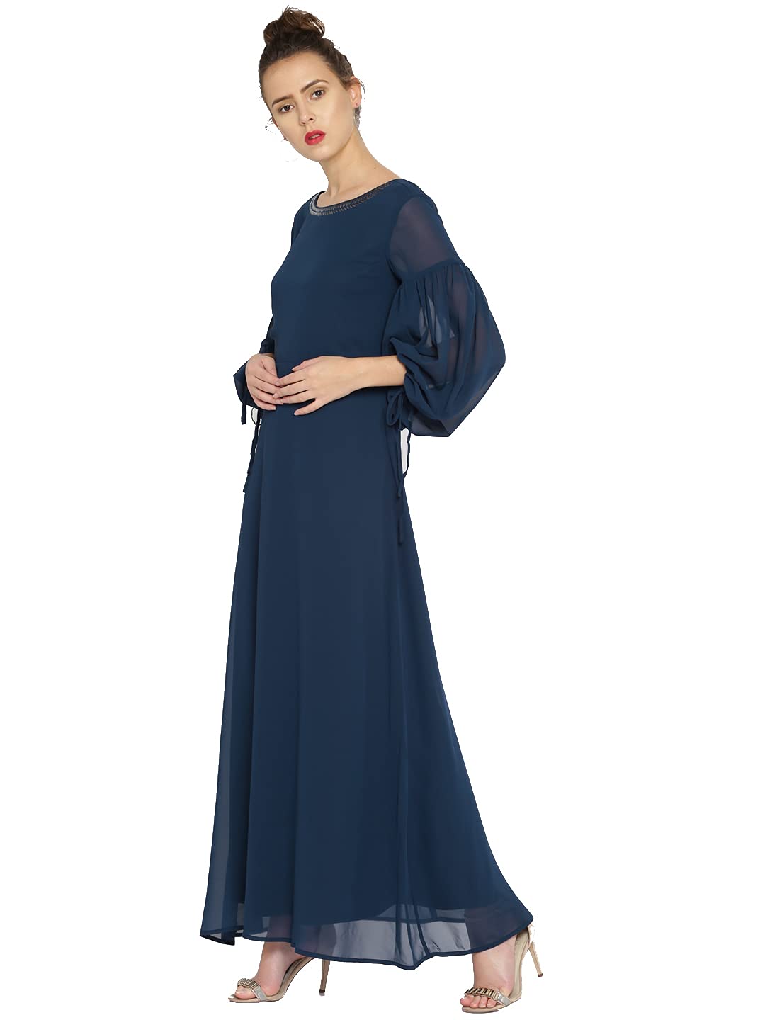 Navy Blue solid woven maxi dress, has a round neck, three-quarter sleeves, straight hem.