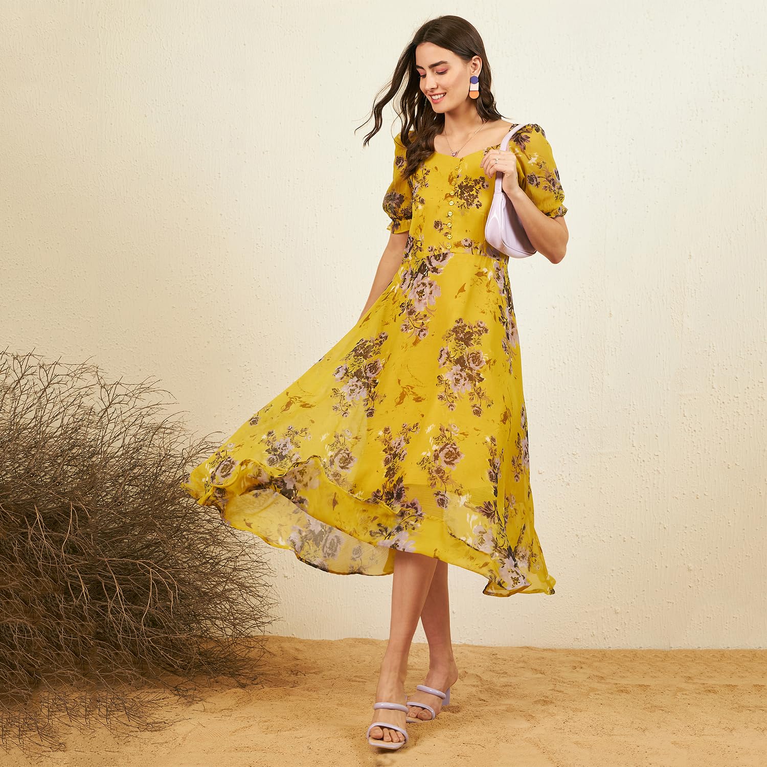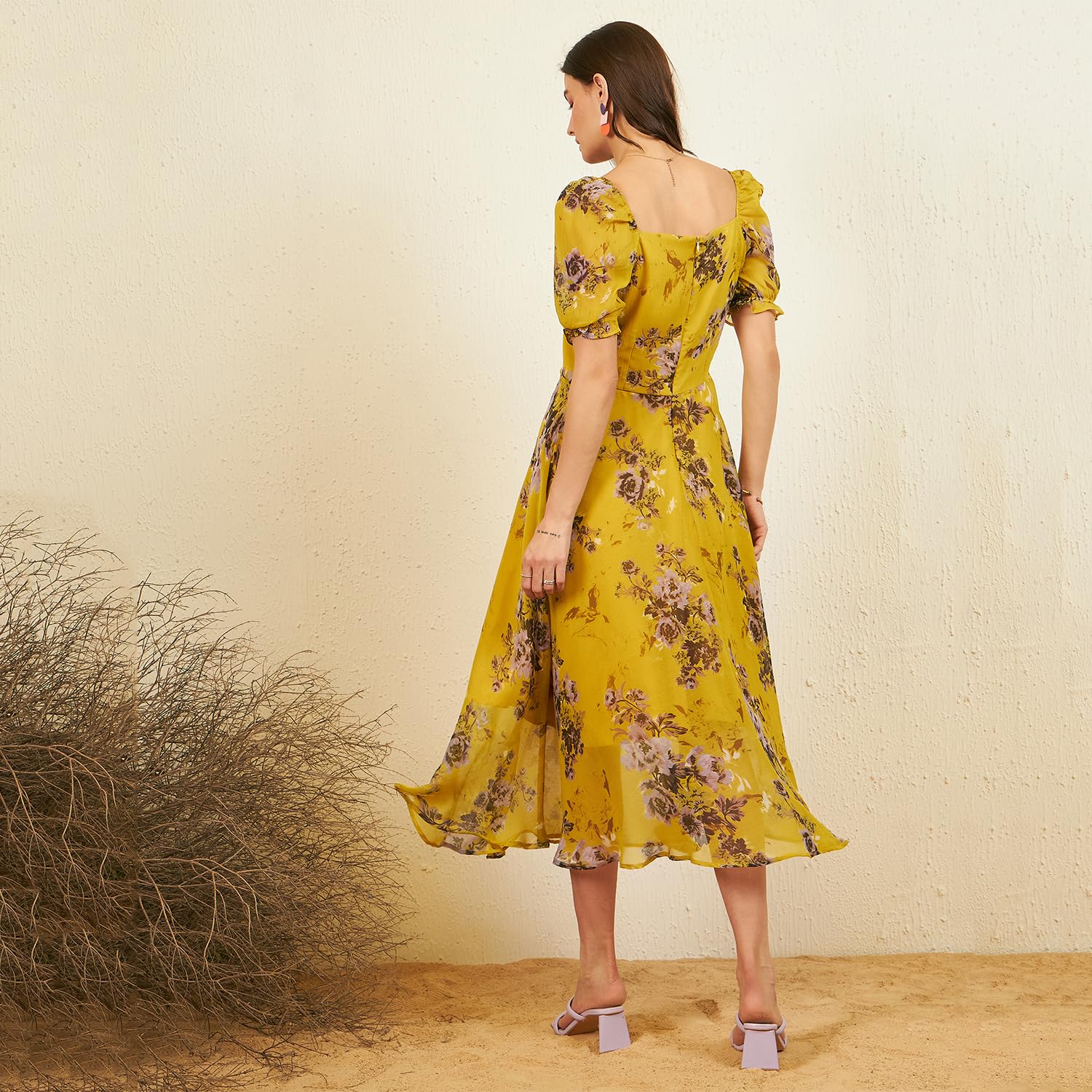 yellow floral maxi fit and flare dress, has a sweetheart neck, short sleeves, regular sleeves, flared hem