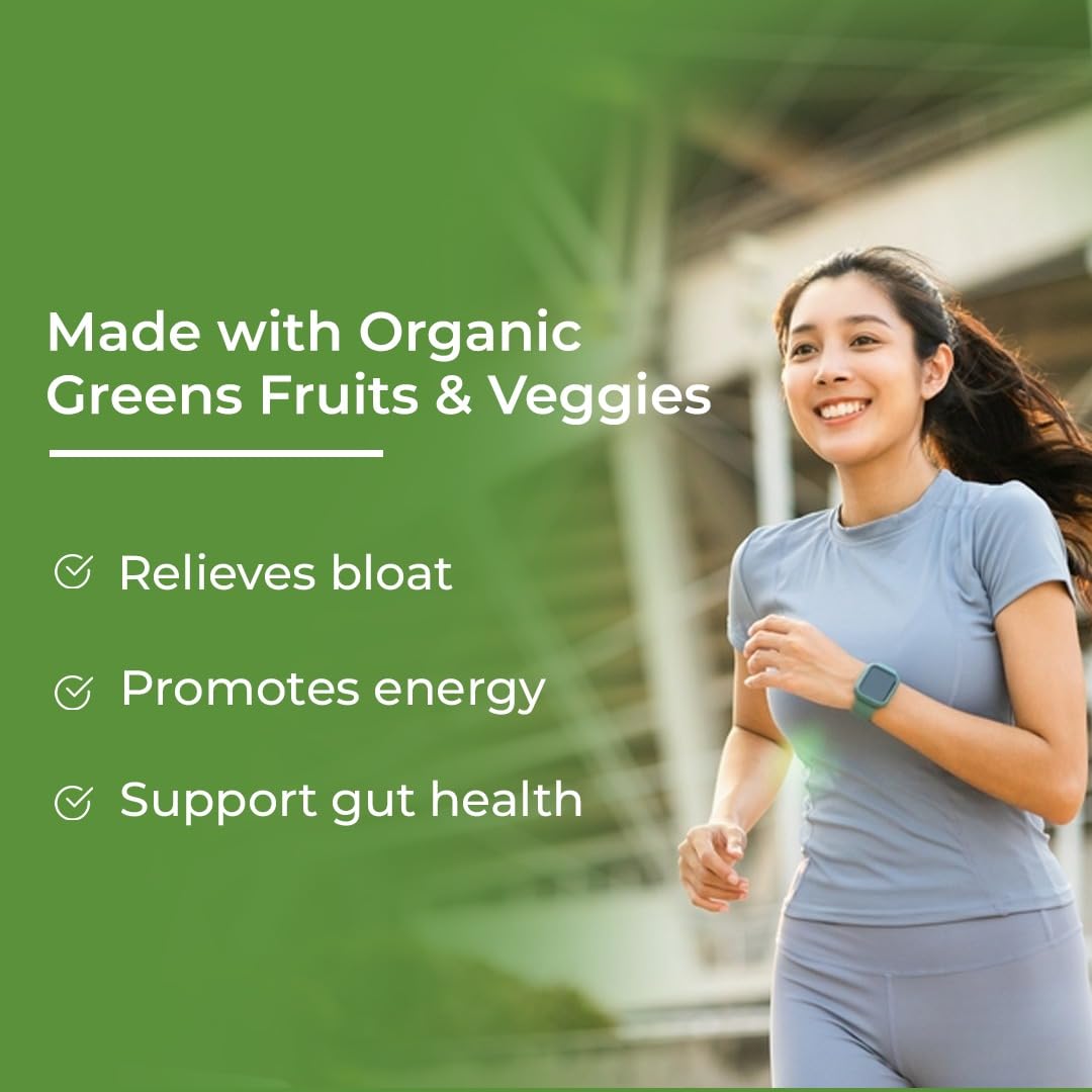 Powerful formulation -22 essential greens & fruits such as – Spicnach, Alfalfa, Spirulina algae, Milk Thistle, Cranberry, Green tea etc; Over 1 bn CFU’s of Probiotic blend, Digestive enzymes