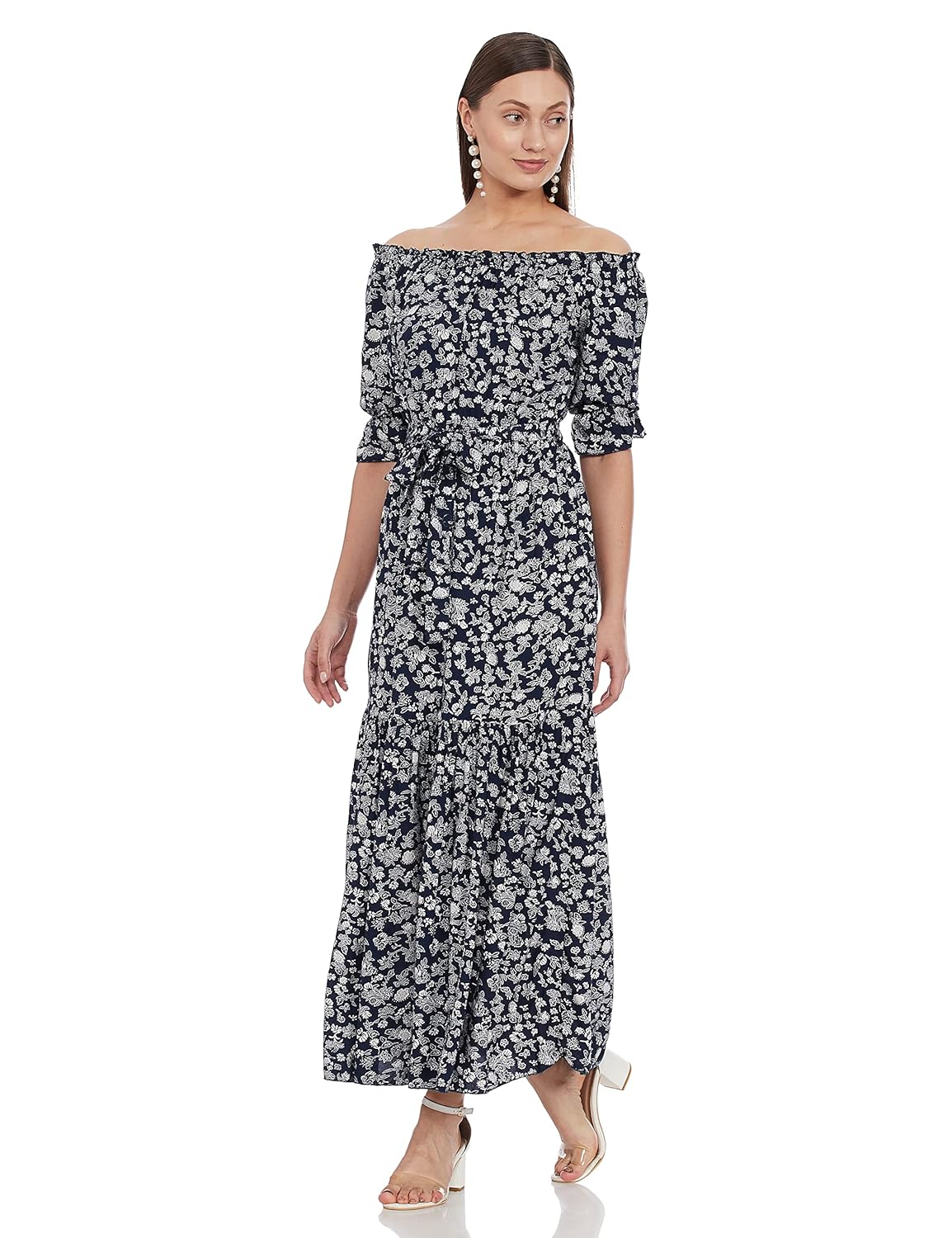 Beige, pink and Black printed woven maxi dress, has an off-shoulder neck, three-quarter sleeves, an attached lining, flared hem, comes with a belt.