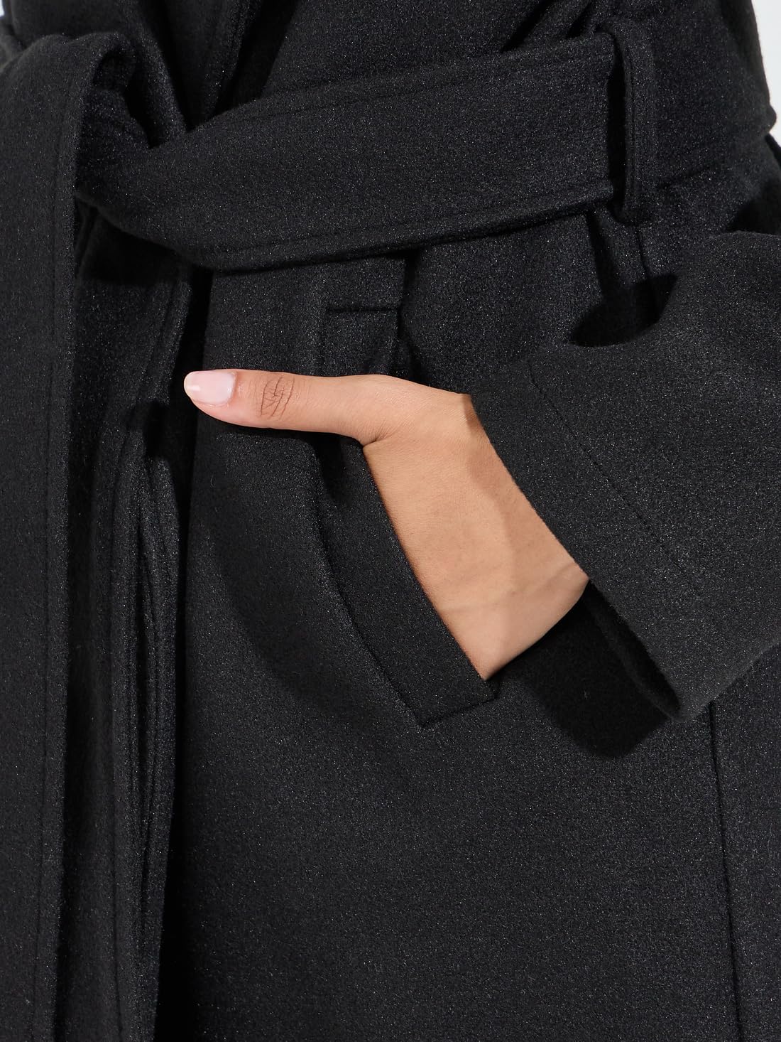 The Styli Women Black Solid Belted Longline Wool Look Coat is a chic and elegant addition to your winter wardrobe. Crafted from polyester with a woven texture, this coat offers a wool-like appearance while being easy to maintain. It features a solid black color with a regular fit and a longline design that provides a sleek silhouette. The V-neck adds a touch of sophistication, and the coat comes with a belt for a flattering, cinched waist. With two functional pockets and a tie-up closure, this coat is both practical and stylish. It’s machine washable, making it a convenient choice for everyday wear.