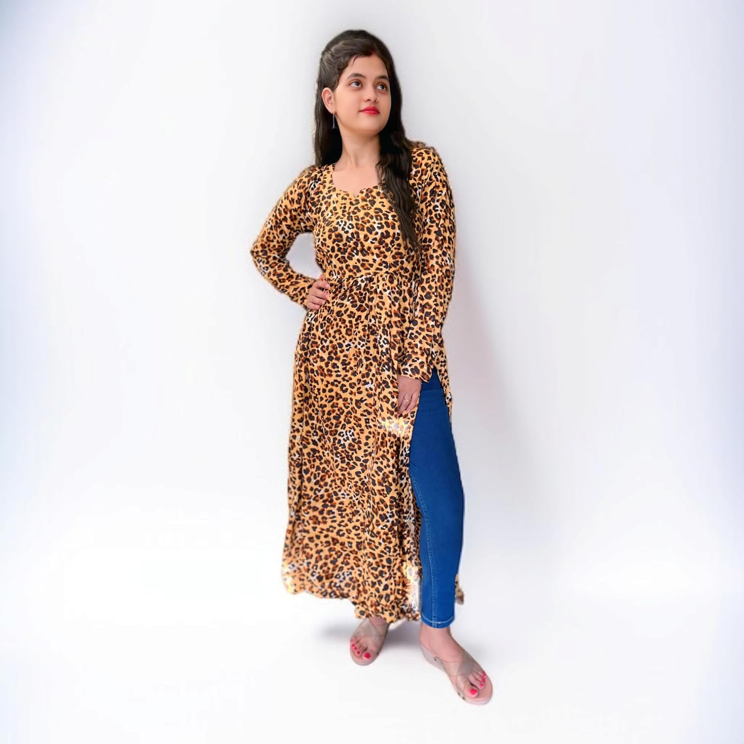 Make a bold fashion statement with this striking leopard print maxi dress. The alluring design features a sophisticated V-neckline and full-length sleeves that add elegance to the silhouette. The dress’s dramatic side slit creates movement and adds a contemporary touch to the classic animal print pattern. Crafted with attention to detail, this versatile piece can be styled with jeans or worn as a standalone dress. The flowing silhouette offers both comfort and style, making it perfect for various occasions from casual outings to semi-formal events. The timeless leopard print in warm, natural tones creates a eye-catching look that’s both fierce and feminine. The full-length design provides graceful coverage while the side slit adds a tasteful touch of allure. This dress seamlessly combines contemporary style with classic appeal, making it a must-have addition to your wardrobe.