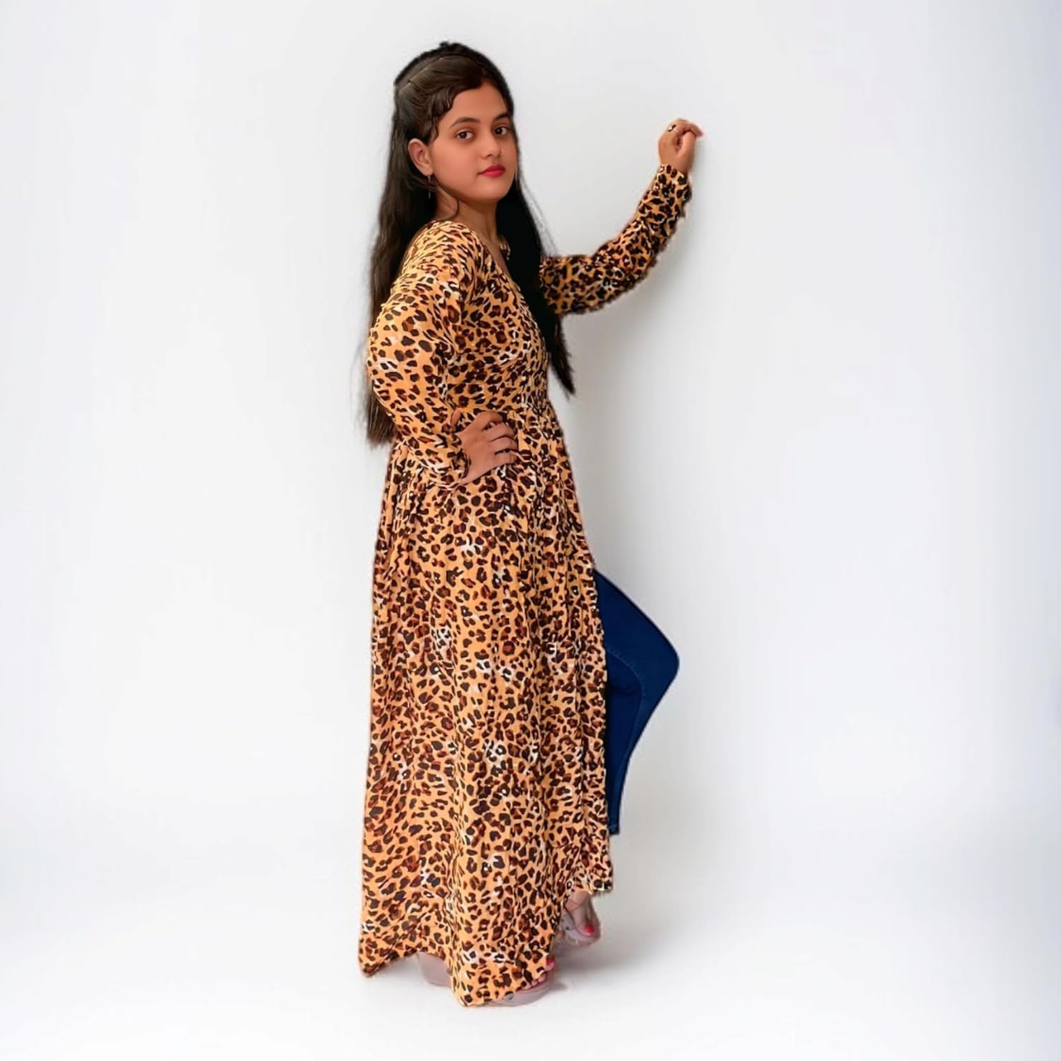 Make a bold fashion statement with this striking leopard print maxi dress. The alluring design features a sophisticated V-neckline and full-length sleeves that add elegance to the silhouette. The dress’s dramatic side slit creates movement and adds a contemporary touch to the classic animal print pattern. Crafted with attention to detail, this versatile piece can be styled with jeans or worn as a standalone dress. The flowing silhouette offers both comfort and style, making it perfect for various occasions from casual outings to semi-formal events. The timeless leopard print in warm, natural tones creates a eye-catching look that’s both fierce and feminine. The full-length design provides graceful coverage while the side slit adds a tasteful touch of allure. This dress seamlessly combines contemporary style with classic appeal, making it a must-have addition to your wardrobe.
