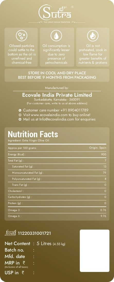 ° Sutra Virgin Olive Oil Benefits : Rich in antioxidants and healthy fats, Supports heart health and immune system. May help reduce inflammation and improve digestion, Supports skin and hair health. Natural anti-inflammatory properties, Supports bone health.