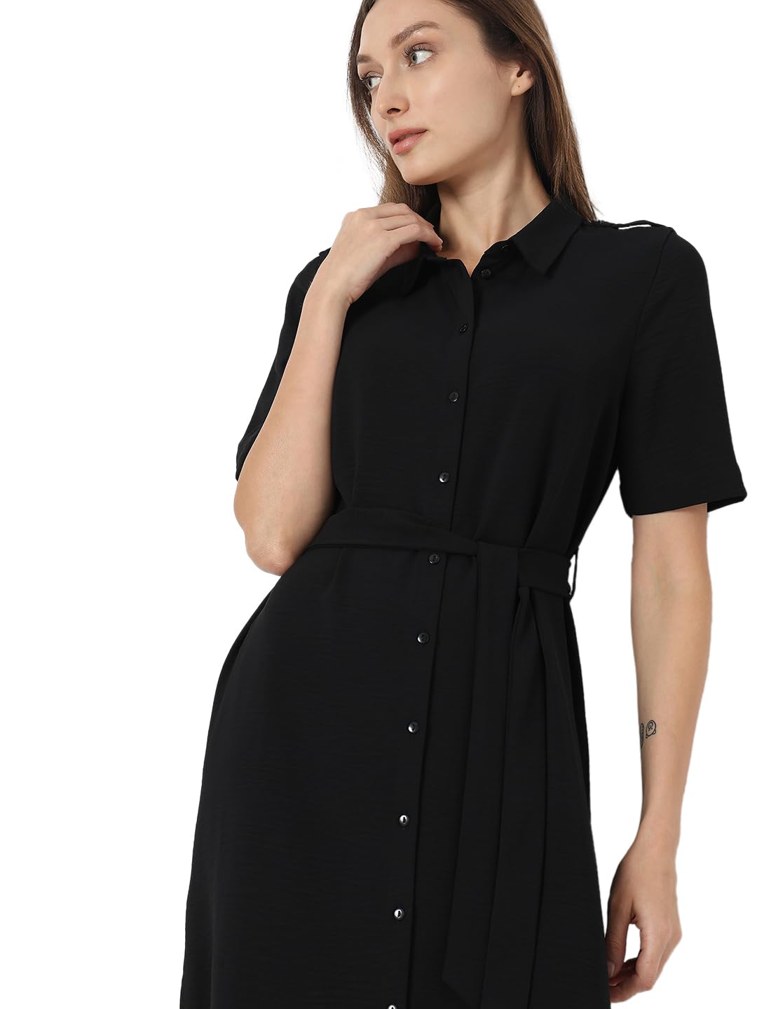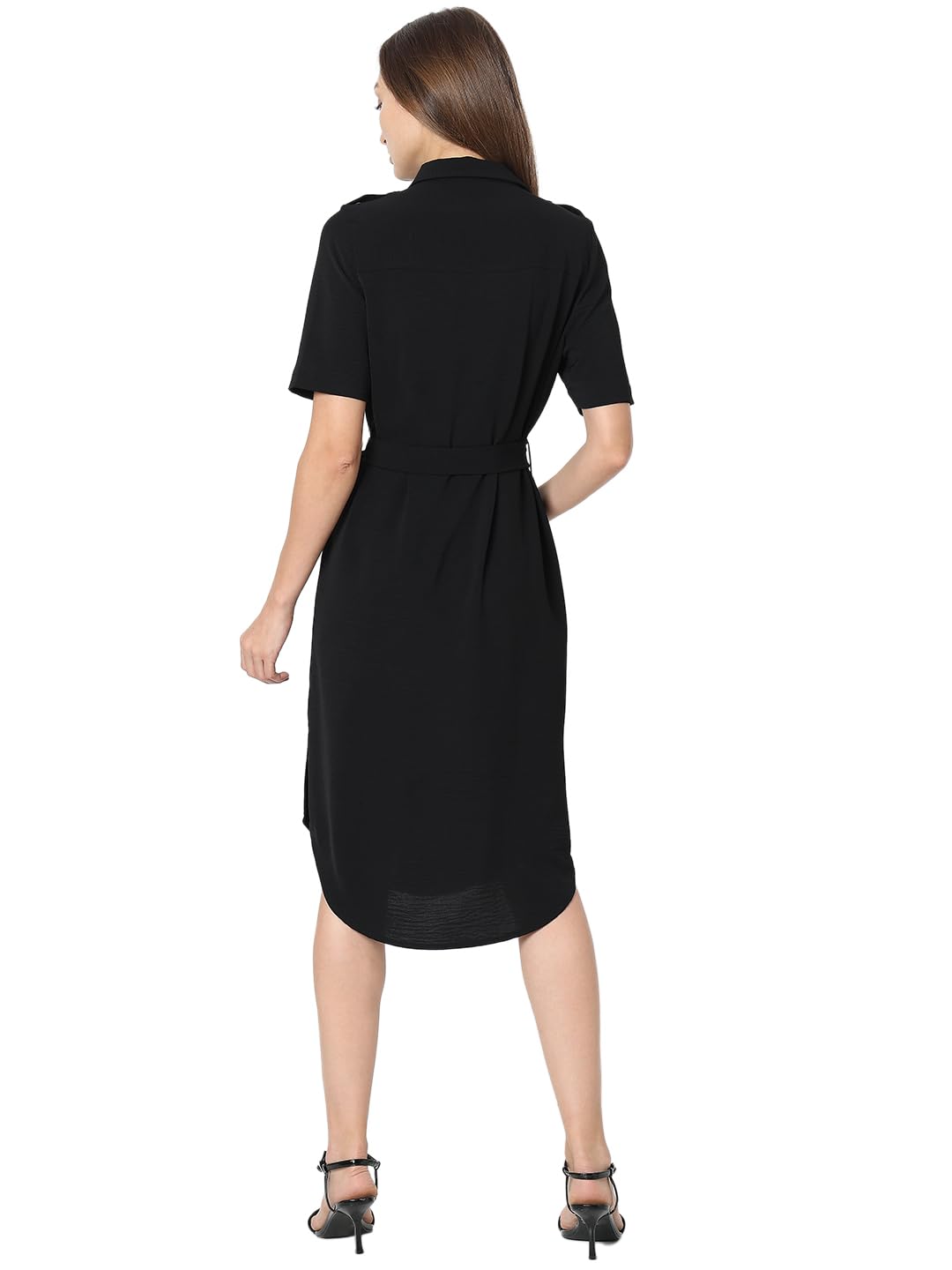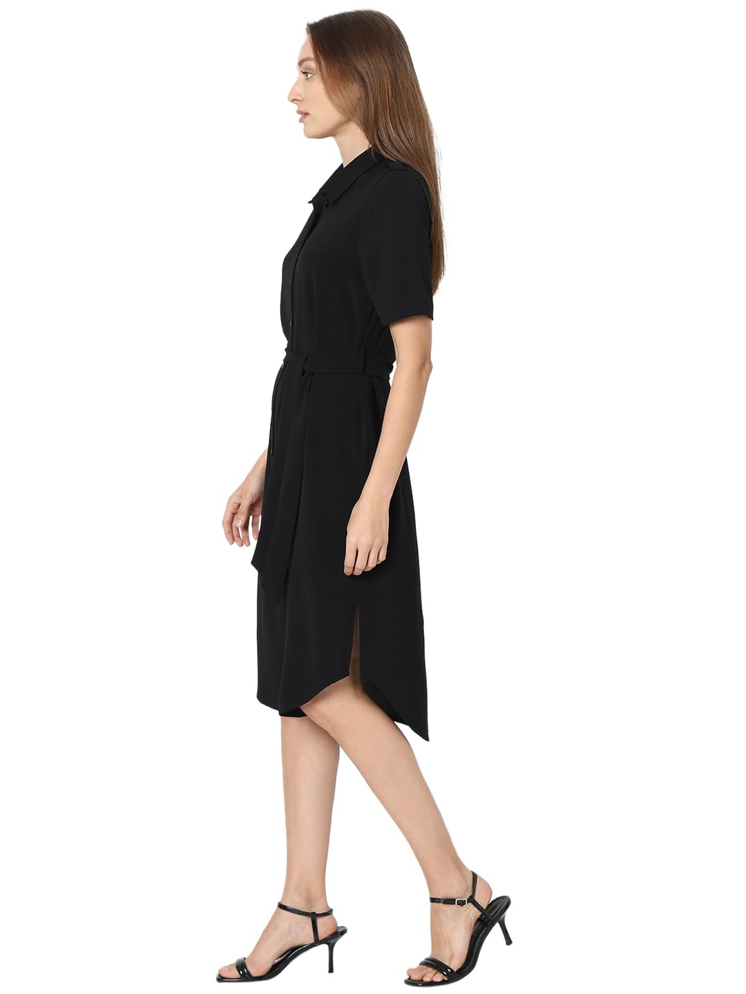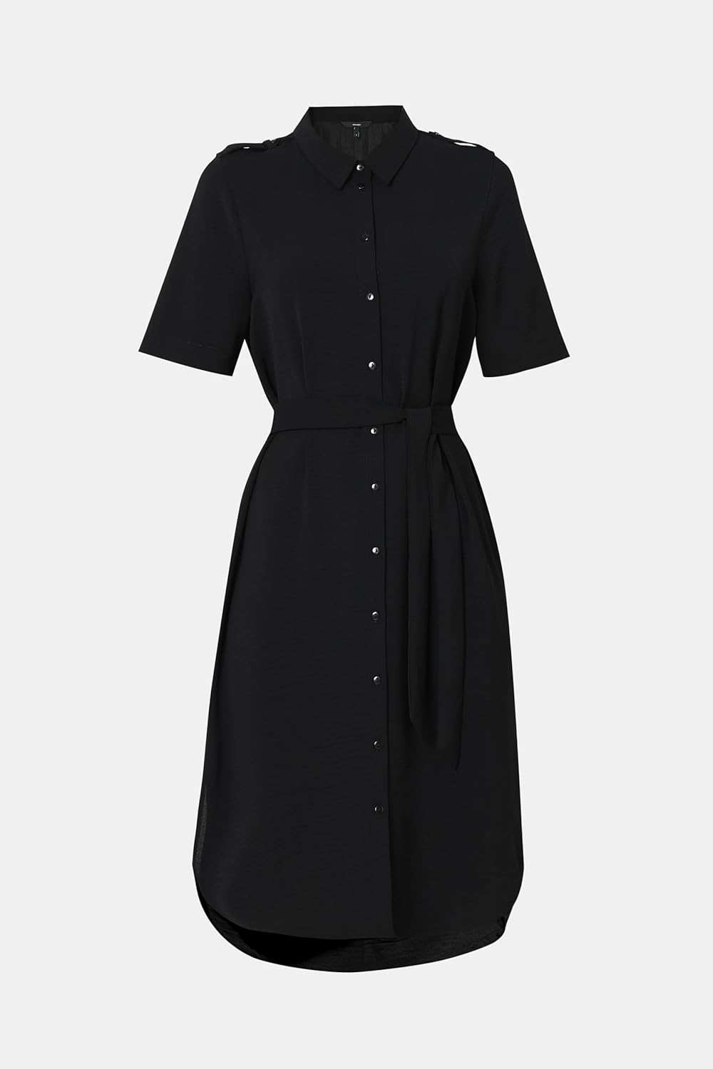 Introducing our chic high-low hemline shirt dress, a versatile addition to your wardrobe. This knee-length beauty features a front button placket, short sleeves, and a self-fabric belt at the waist with discreet belt loops on the side seam for a tailored fit. Effortlessly combining refinement with a casual vibe, this dress is perfect for both work and weekend occasions. Elevate your style effortlessly with this must-have piece.