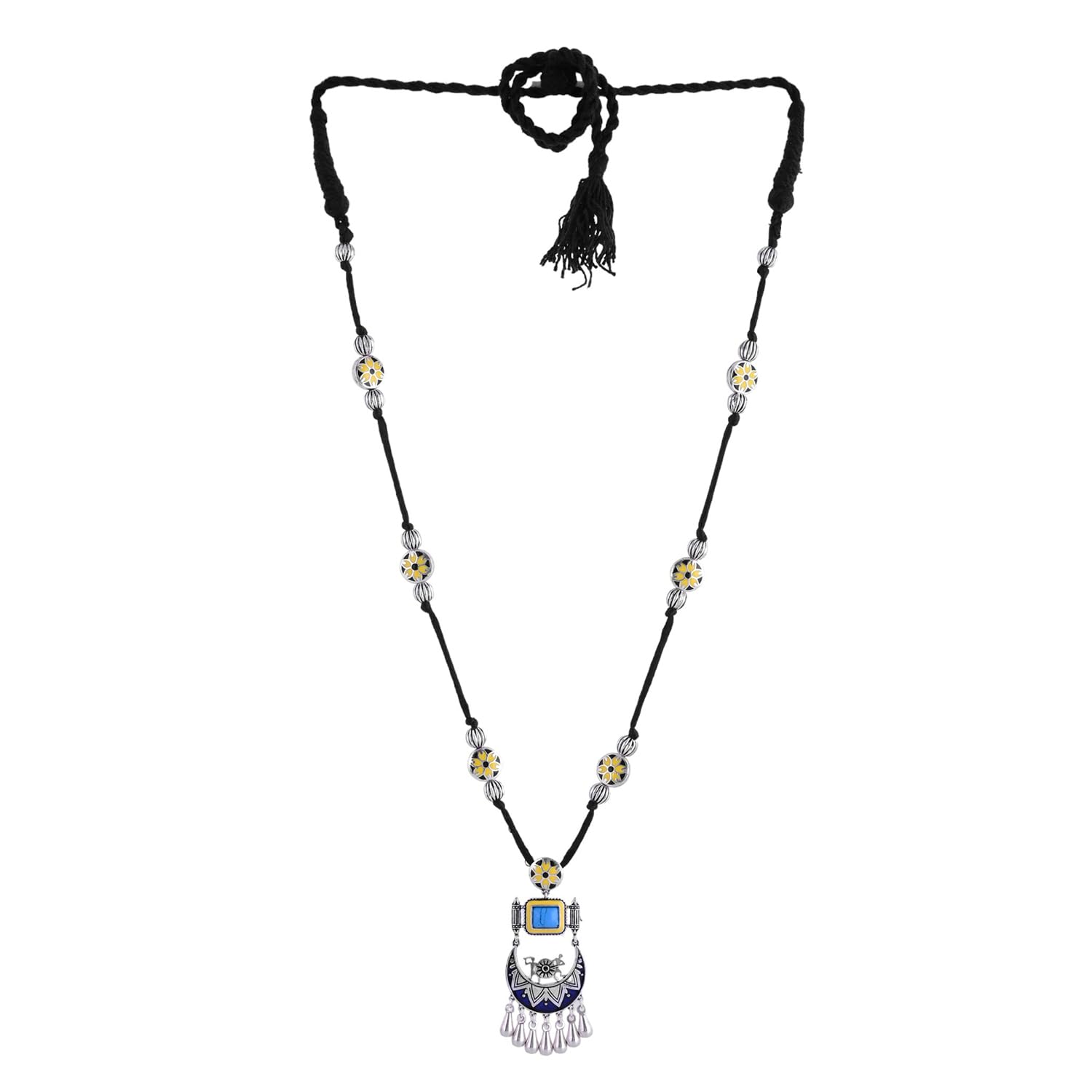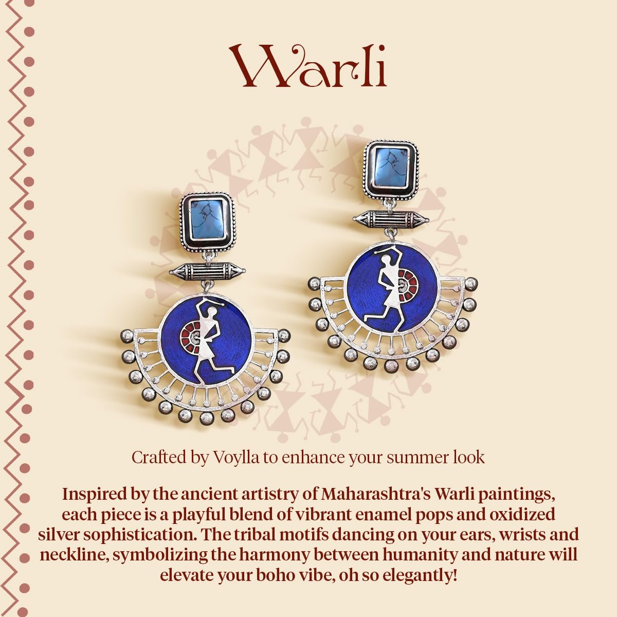 Rustic charm and Bohemian grace meet in this lovely necklace, which has been inspired by the Warli artform. Made from brass and silver plated, the enamelled necklace has been embellished with white pearls. Pair the necklace with any of your favourite outfits.
