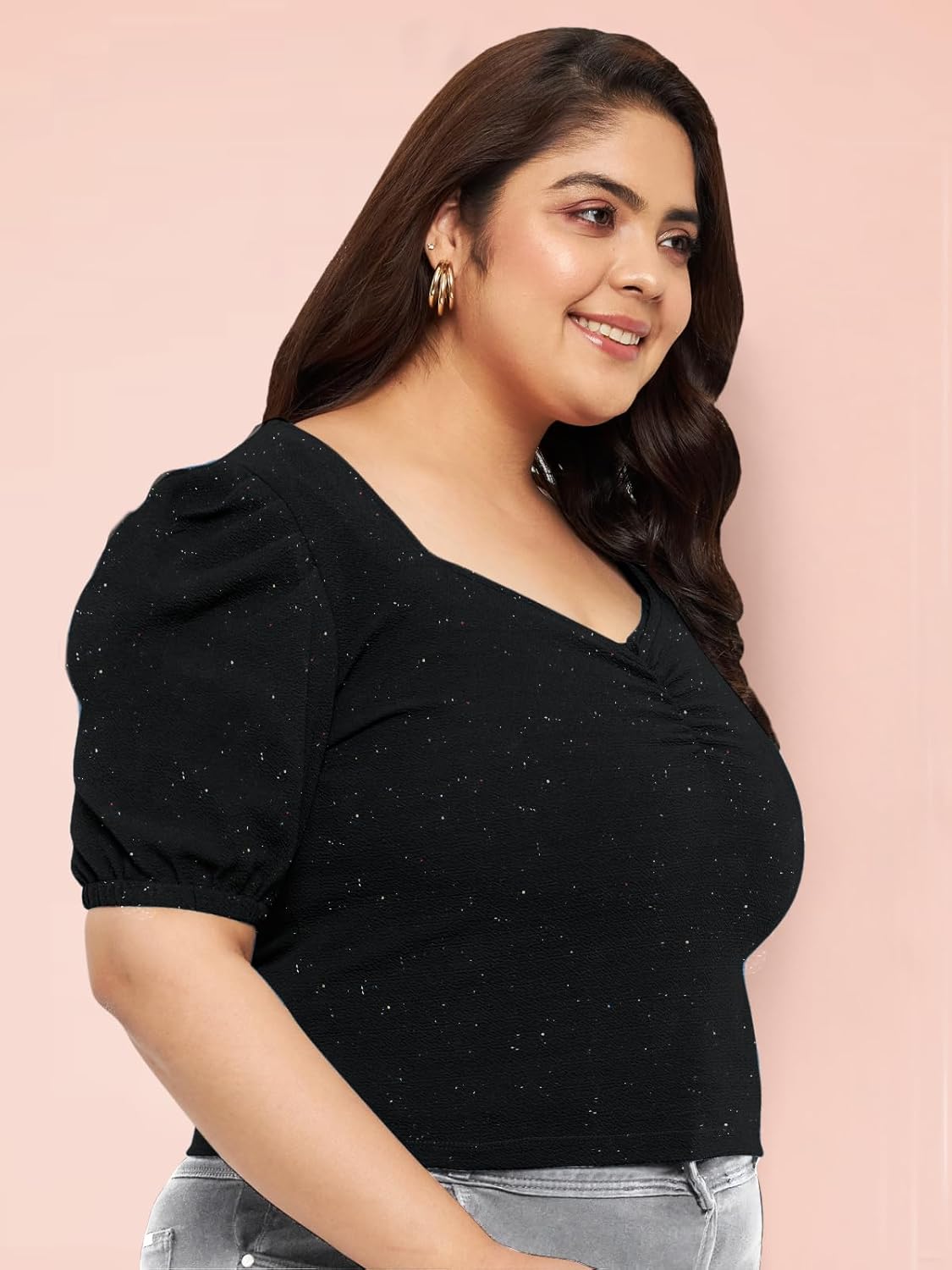 wild U Women Western Plus Size Crop Top| Shimmer | Puff Sleeve | Stretchable | Stylish Top for Curvy Women (Black)