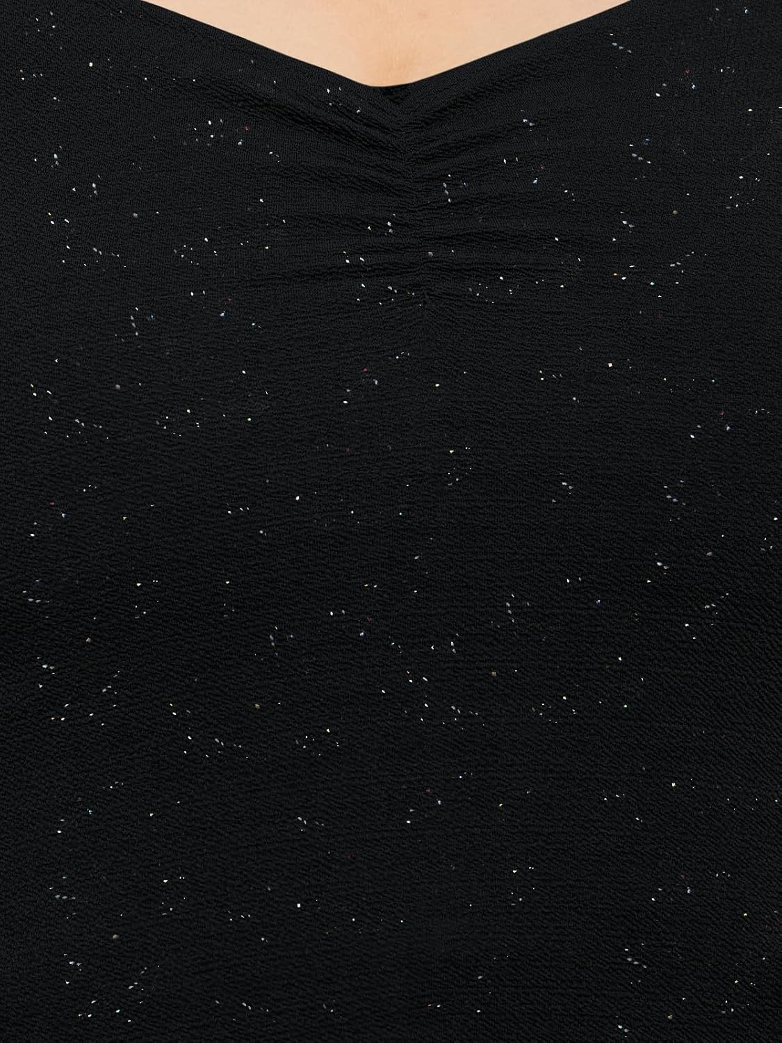Plus size black shimmered stretch crop top for curvy women with a slip-on design. Features an elasticated ruched sweetheart neckline and short puff sleeves, creating a charming and elegant look. To confirm your size before purchase, refer to the Size Chart in the images