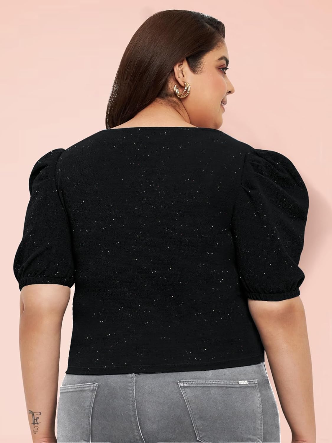 wild U Women Western Plus Size Crop Top| Shimmer | Puff Sleeve | Stretchable | Stylish Top for Curvy Women (Black)
