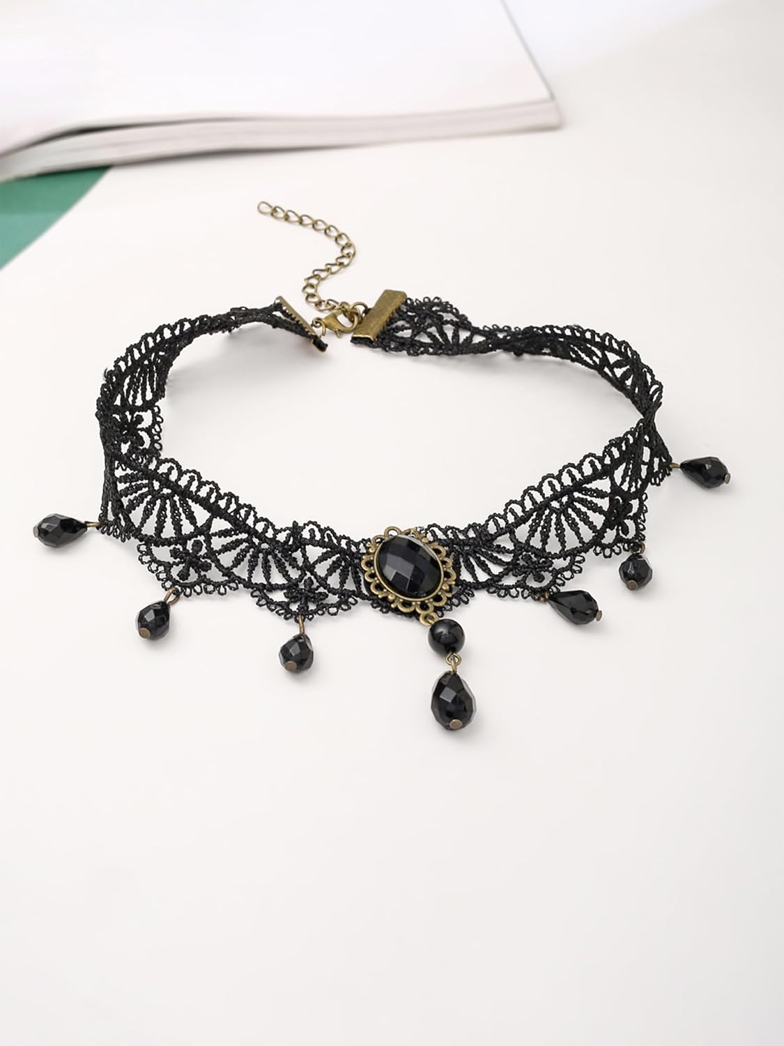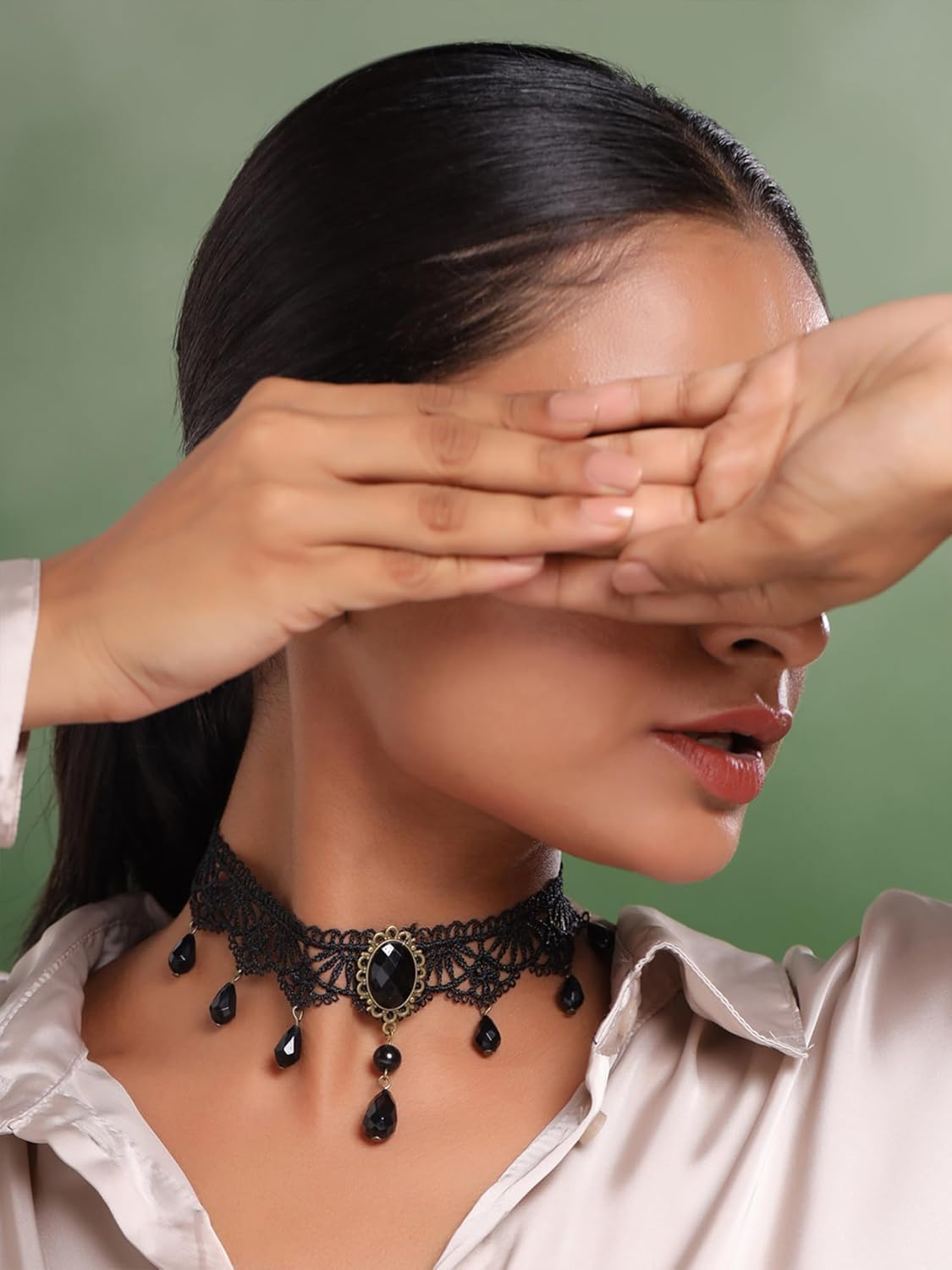 Yellow Chimes Necklace For Women Black Fabric Lace With Black Stone Hanging Choker Necklace For Women and Girls