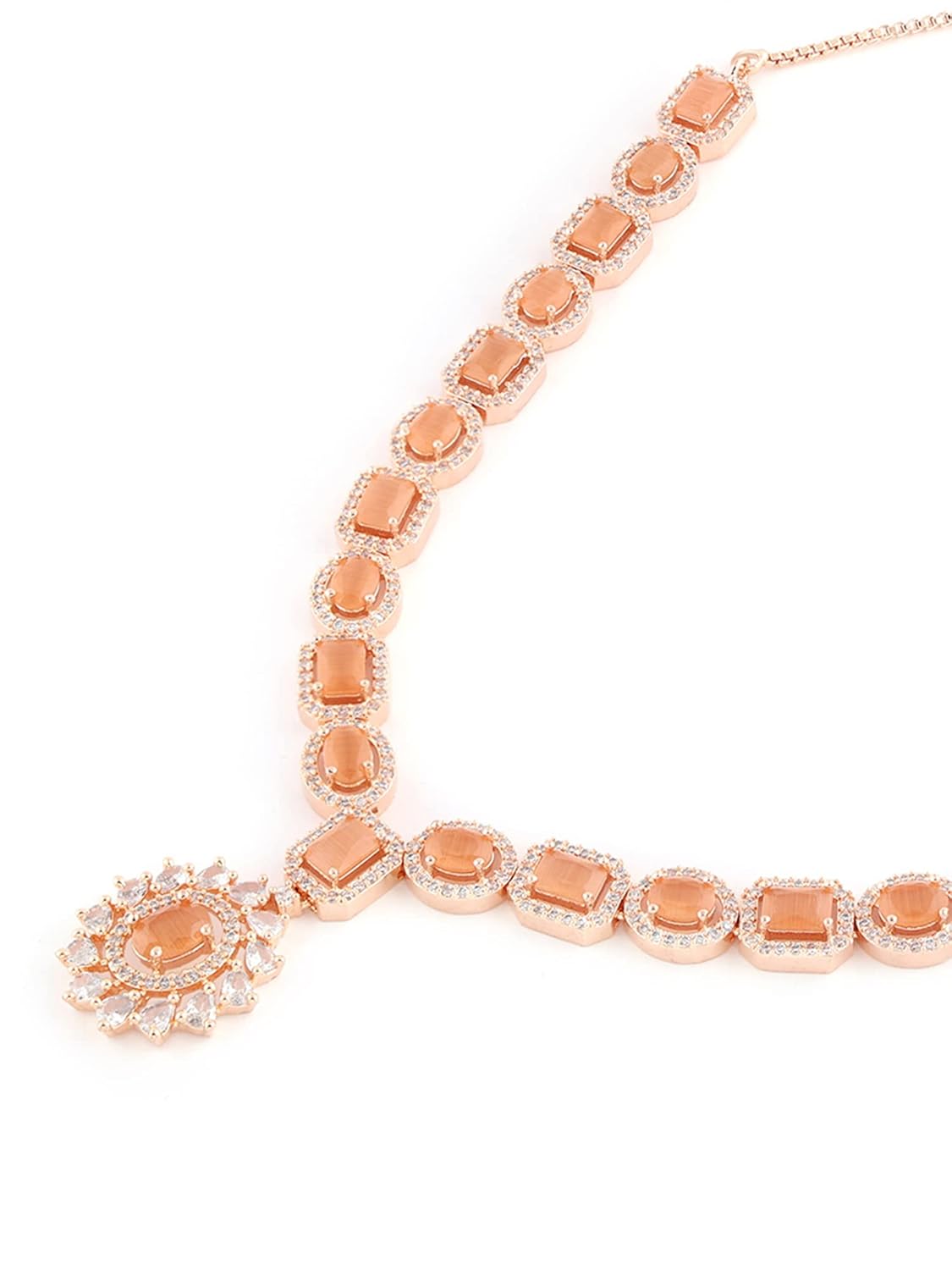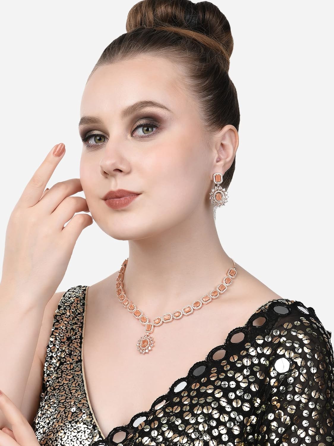 Since Cubic Zirconia was introduced into the fashion world, there have not been any gemstones that have made as much impact as Cubic Zirconia. Presenting rose gold plated necklace & earring set, embellished with dazzling cubic zirconia. This Gorgeous jewellery featuring stunning diamonds instantly transforms a great outfit into one that mesmerizes, adding a subtle feminine touch to your overall look.