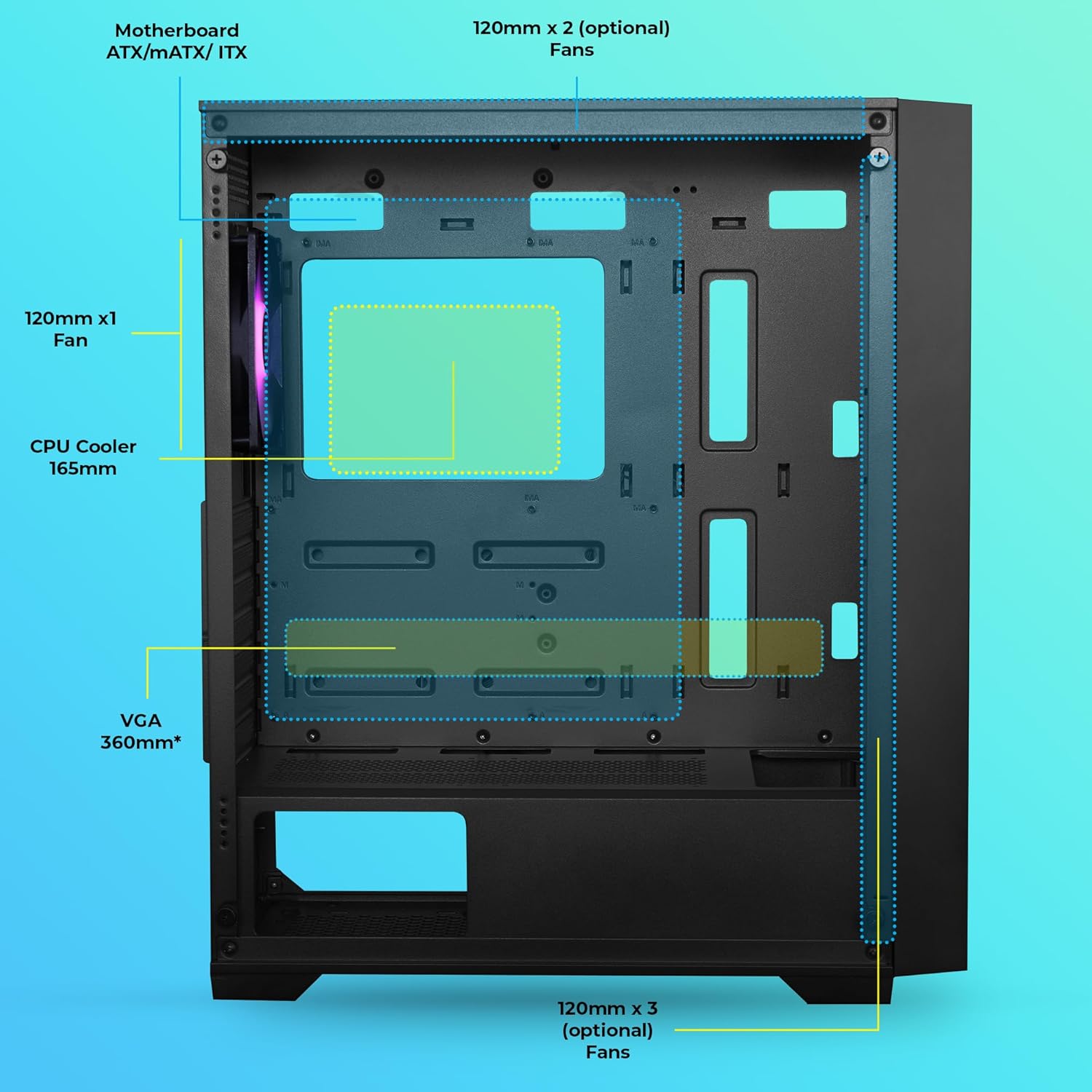 A 120mm inner glow ARGB cooling fan on the rear and 3x120mm fans on the front provide the chassis with ample airflow. For sufficient ventilation, you can optionally add 2 more 120mm cooling fans at the top
