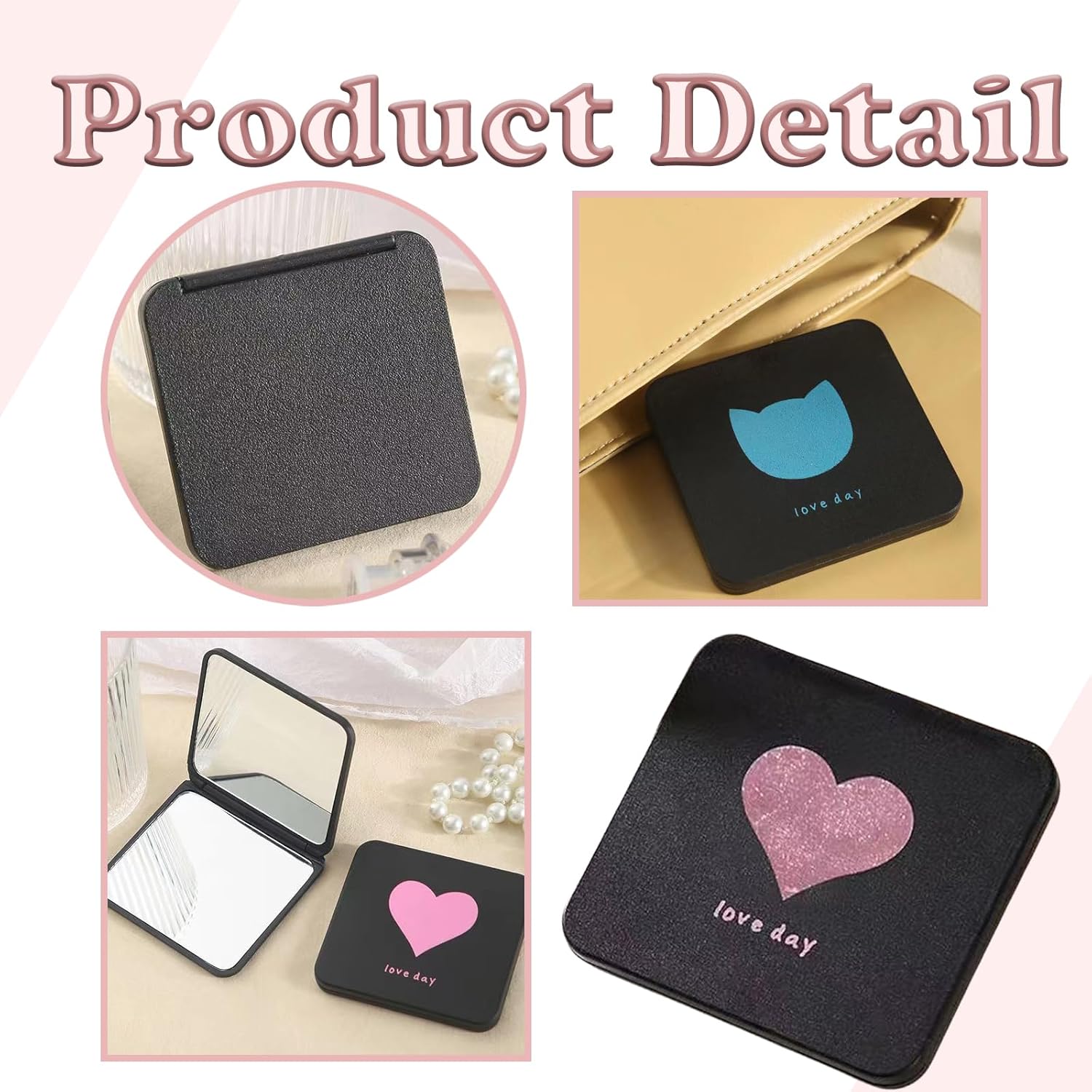 2 PCS Foldable Makeup Mirror Premium Travel Makeup Vanity Mirror Black Travel Makeup Mirrors Magnifying Beauty Compact Mirror for Girls Portable Handheld 2-Sided Folding Cosmetic Mirror Package included:Includes two hand mirror,makeup mirror is heart-shaped pattern, and the other is cat shaped pattern for your daily needs. Quality Guarantee: Mirror for makeup Made of high-quality material, sturdy and durable. Compact Face Mirrors: A two-sided mirror suitable for cosmetic use. The primary mirror perfectly reflects a clear image of the entire face while the other side is 3x magnified and is excellent for applying mascara, plucking Makeup Mirror For Travel: This small, slimline mirror fits in your purse or handbag and is easy to carry wherever you go. Multi-Function: This mirror can also be used as a compact mirror, travel mirror or table mirror, bathroom mirror, or as a make-up mirror for a salon. pocket mirror for women serves the purpose whether small mirrors grooming, makeup, wearing contact lens, daily makeup, hairy styling etc.