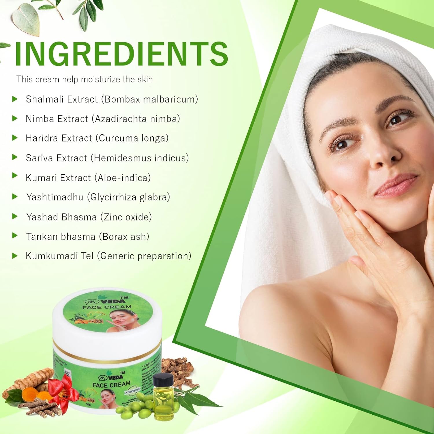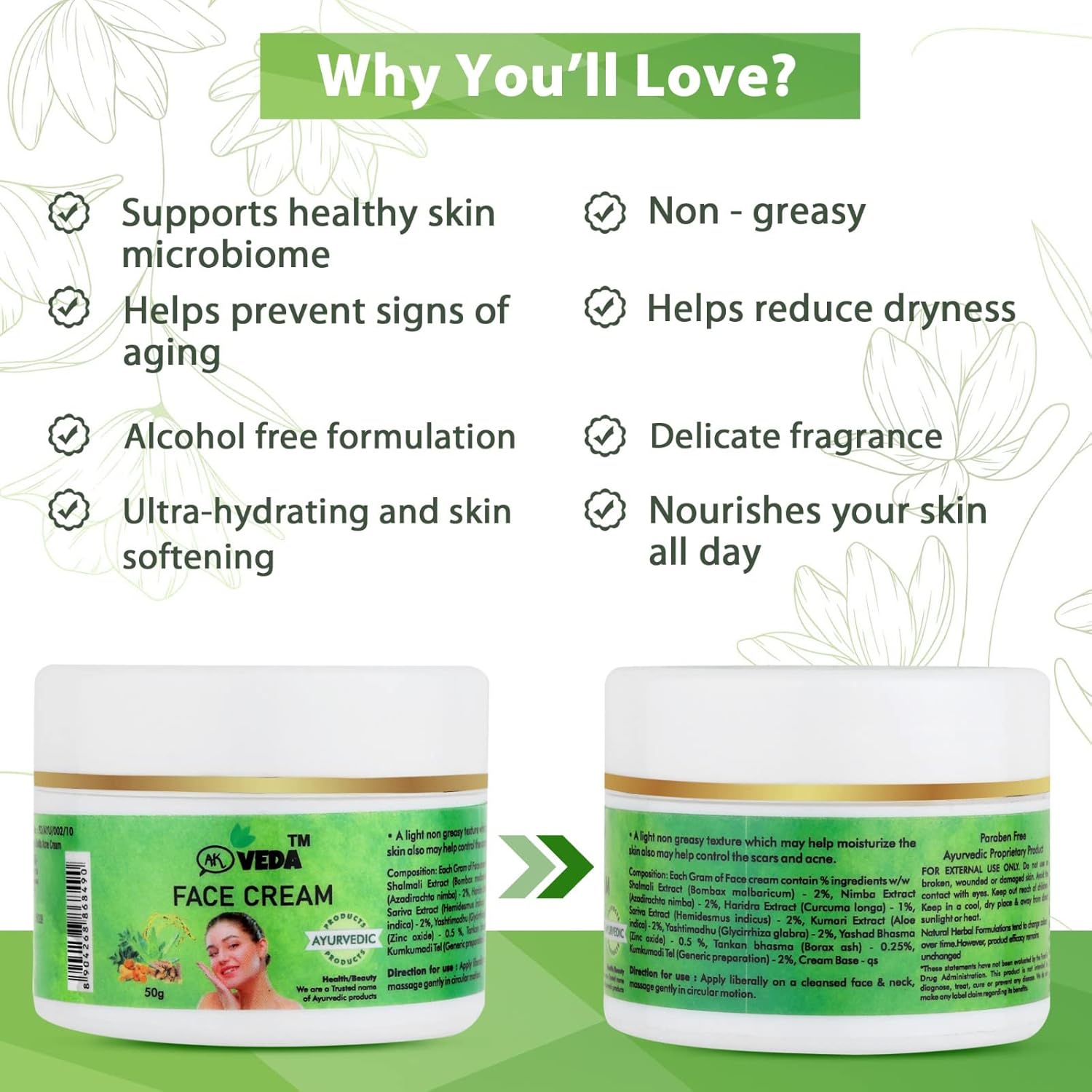Ak Veda face cream is to provide hydration and nourishment to the skin on the face. It helps to keep the skin moisturized, which can prevent dryness and flakiness, and can also help to reduce the appearance of fine lines and wrinkles.