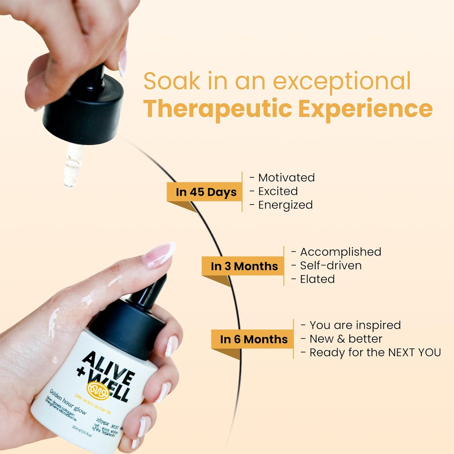 Indulge In The Luxury of 24K Gold: Experience the Midas touch in every drop of our 24K Gold Glow Oil. Infused with 24K gold flakes, the Golden Hour Glow by Alive + Well, gives your skin a divine shine while visibly reducing fine lines and wrinkles, strengthening the skin’s defense system while adding antioxidant properties.