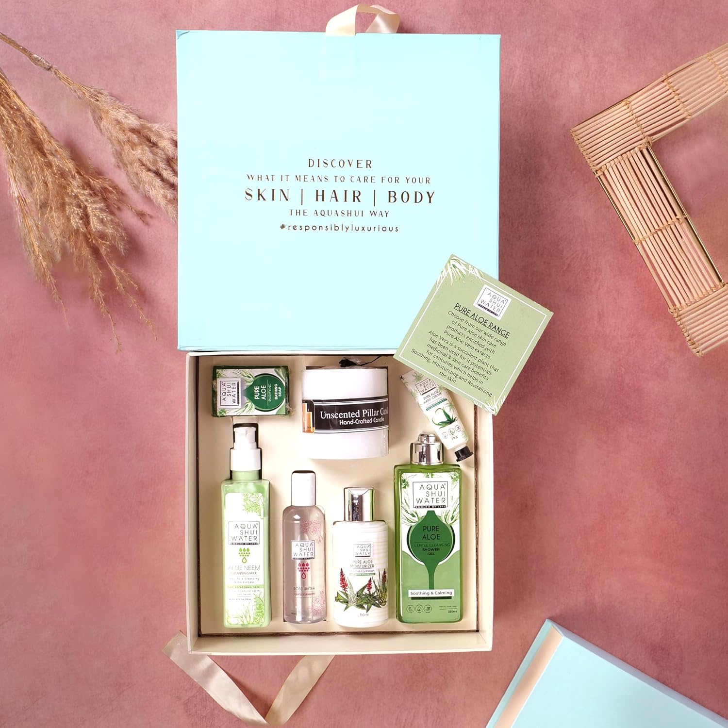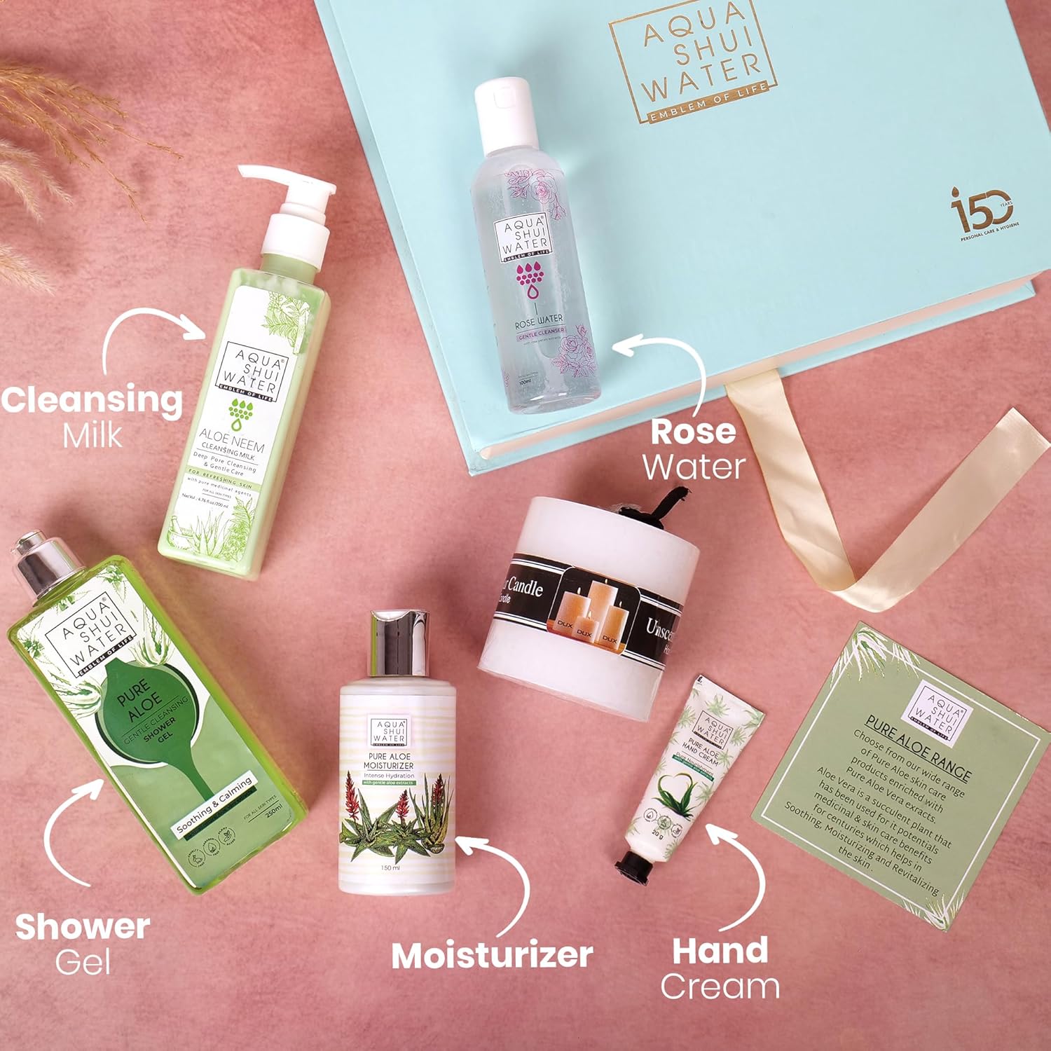 Pamper yourself or a loved one with the Aqua Shui Water Body Care Gift Set, a luxurious 7-piece kit designed to provide the ultimate self-care experience. Infused with hydrating and nourishing ingredients, this skincare set includes: Aloe Neem Cleansing Milk – Gently removes impurities while keeping the skin soft and hydrated. Rose Water – A natural toner that refreshes and revitalizes the skin. Pure Aloe Moisturizer – Deeply nourishes and locks in hydration for a glowing complexion. Pure Aloe Shower Gel – Leaves the skin feeling fresh, clean, and fragrant. Pure Aloe Bathing Soap – Enriched with essential oils for a soothing bath experience. Scented Candle – Enhances relaxation with a calming aroma. Pure Aloe Hand Cream – Provides long-lasting moisture and softness to hands. Ideal for Every Occasion! This beautifully packaged luxury skincare gift box is perfect for birthdays, Mother’s Day, Valentine’s Day, Christmas, anniversaries, or as a thoughtful self-care treat. Why Choose Aqua Shui? Dermatologist-Tested Cruelty-Free Free from Harsh Chemicals Suitable for All Skin Types Transform your skincare routine with Aqua Shui – the perfect gift of relaxation and beauty!