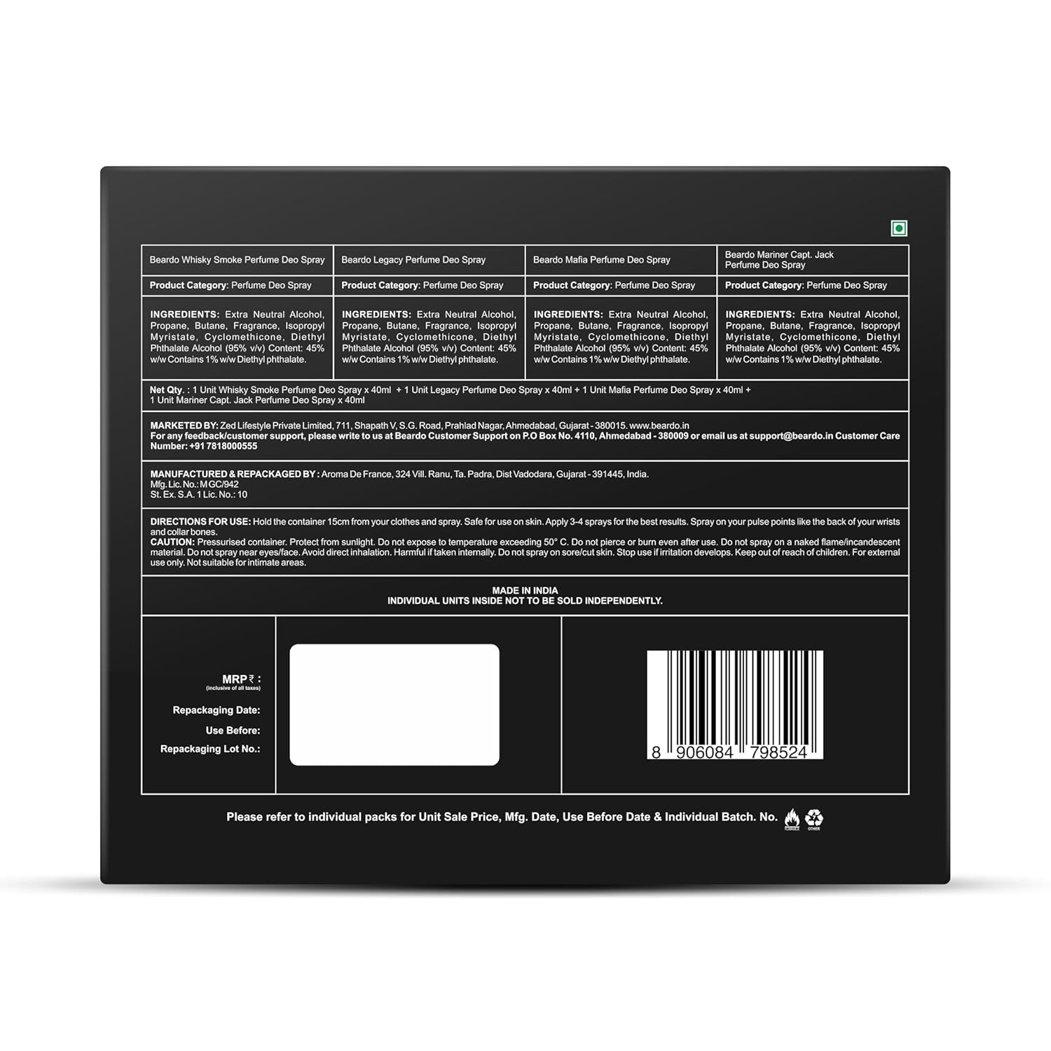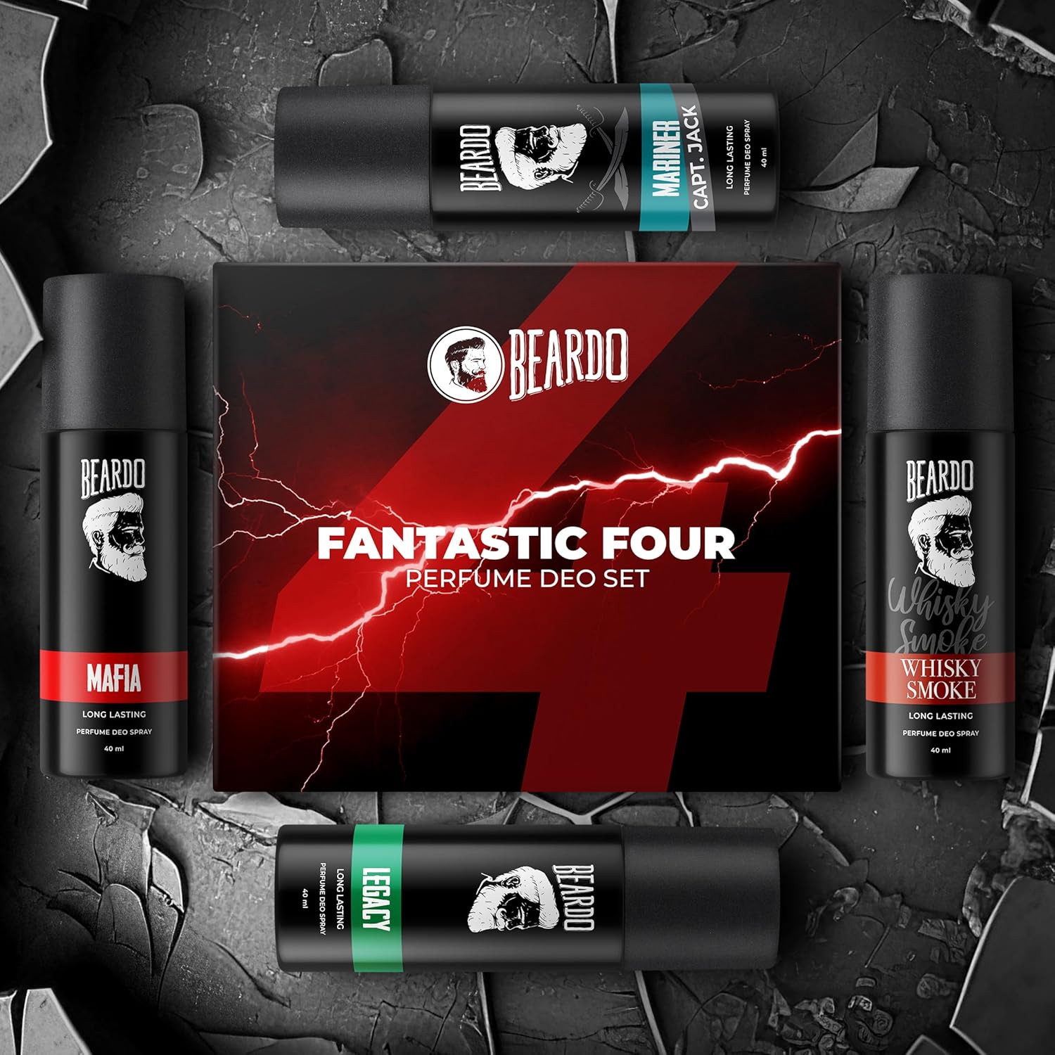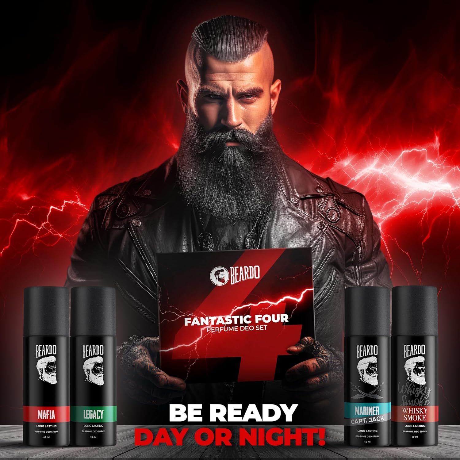 COMBO for 4 Deos: Beardos fantastic four combo gift set contains 4 perfume body sprays – Legacy Pefume Body Spray, Whisky Smoke Perfume Body Spray, Mariner Capt. Jack Perfume Body Spray and Mafia Perfume Body Spray