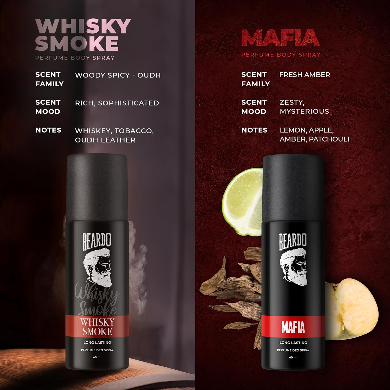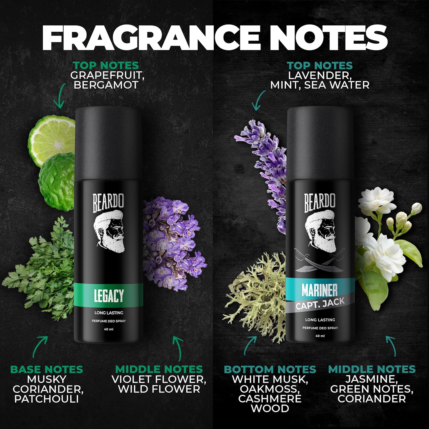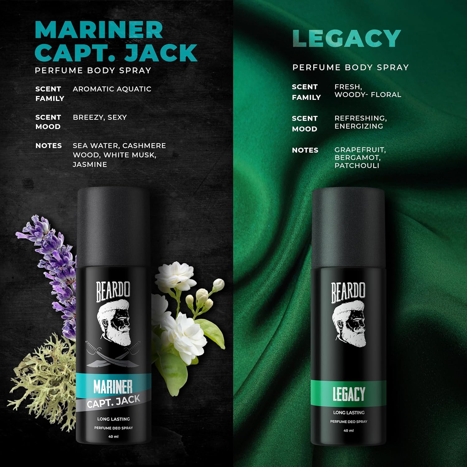 COMBO for 4 Deos: Beardos fantastic four combo gift set contains 4 perfume body sprays – Legacy Pefume Body Spray, Whisky Smoke Perfume Body Spray, Mariner Capt. Jack Perfume Body Spray and Mafia Perfume Body Spray