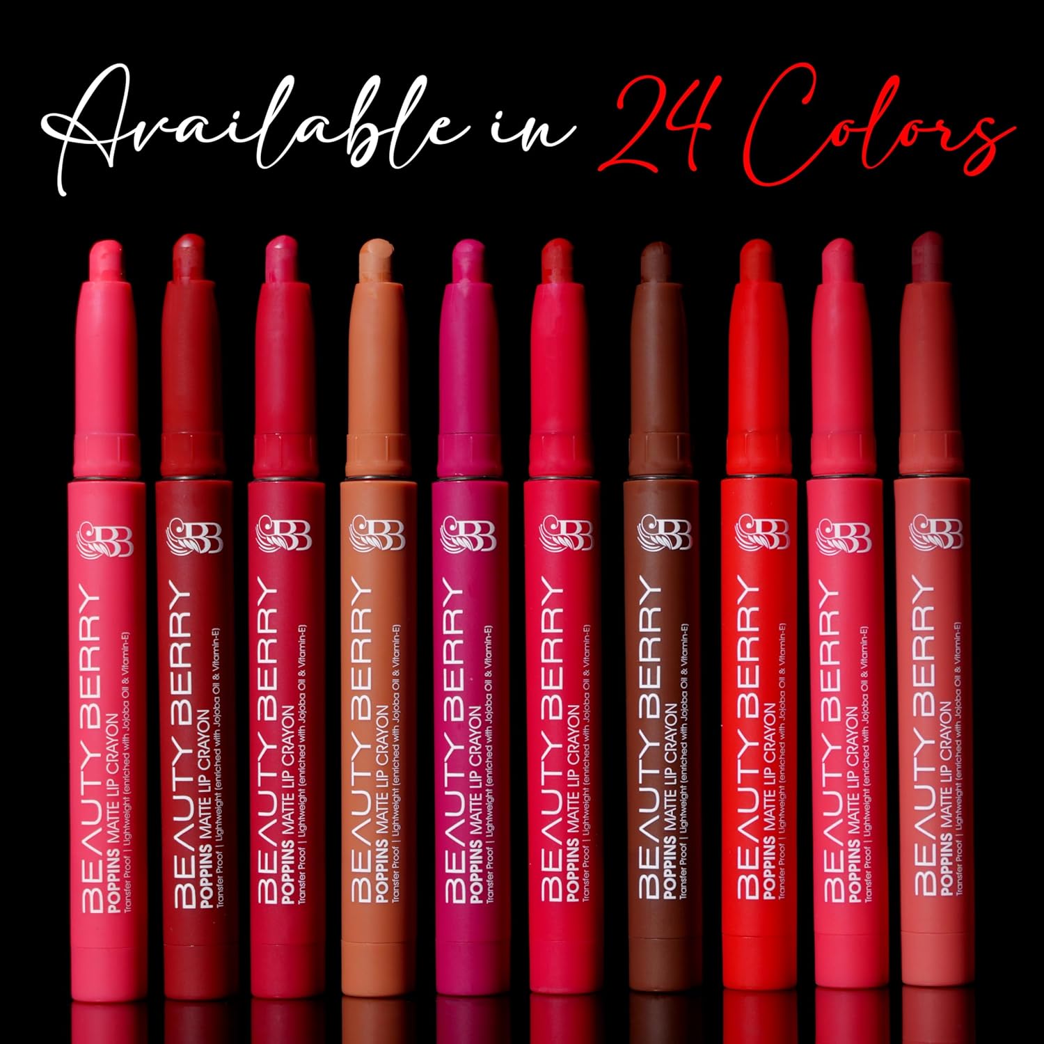 Introducing “Beauty Berry Poppins Matte Crayon Lipstick.” This lipstick is made with high quality ingredients like Jojoba oil and Vitamin E that are 100% safe and gentle on your lips. The waterproof and non transfer formula ensures that your lipstick won’t smudge or budge even in the rain. Don’t worry about touch-ups or reapplying multiple times a day. Beauty Berry Poppins crayon is long-lasting, non-transferrable, waterproof & smudge-proof crayon lipstick available in a range of stunning 24 shades, so you can find the perfect color to match any outfit or occasion. The pure matte finish of Beauty Berry Poppins matte lipstick is both elegant and versatile, allowing you to wear it for any occasion.