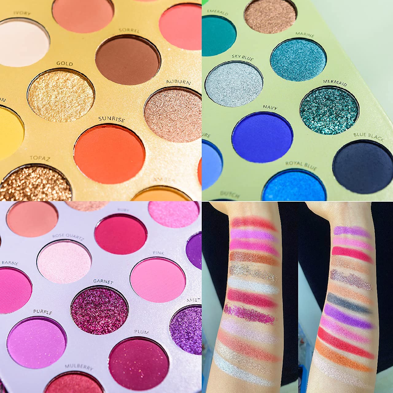 *Lots of great colors to choose from,nice mix of shimmers, mattes and glitters,blend and transfer well.Easy to get onto the brush especially the glitter.