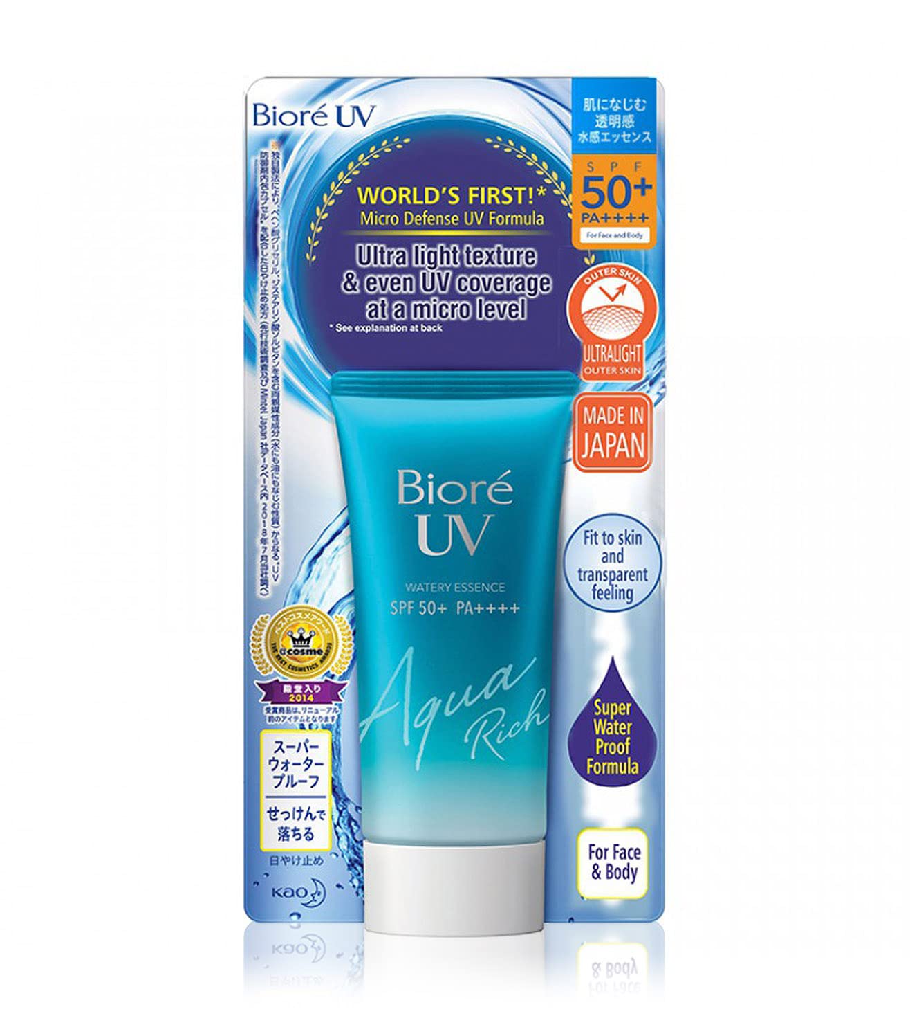 his Biore UV Aqua Rich Watery Essence Sunscreen SPF 50+ PA++++ has a transparent texture and provides a light sensation on the skin, even when reapplying during the day. Biore UV Aqua Rich Watery Essence Sunscreen SPF 50+ PA++++ protects from damaging UV rays. It is enriched with hyaluronic acid, royal jelly extract and butylene glycol. The aqua microcapsules release moisture upon application. It has a lightweight texture that spreads easily without leaving a white cast. It is water-resistant for up to 80 minutes.