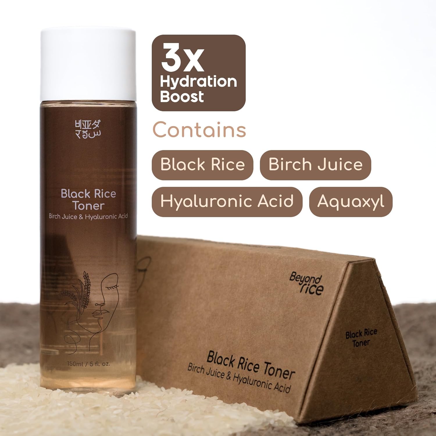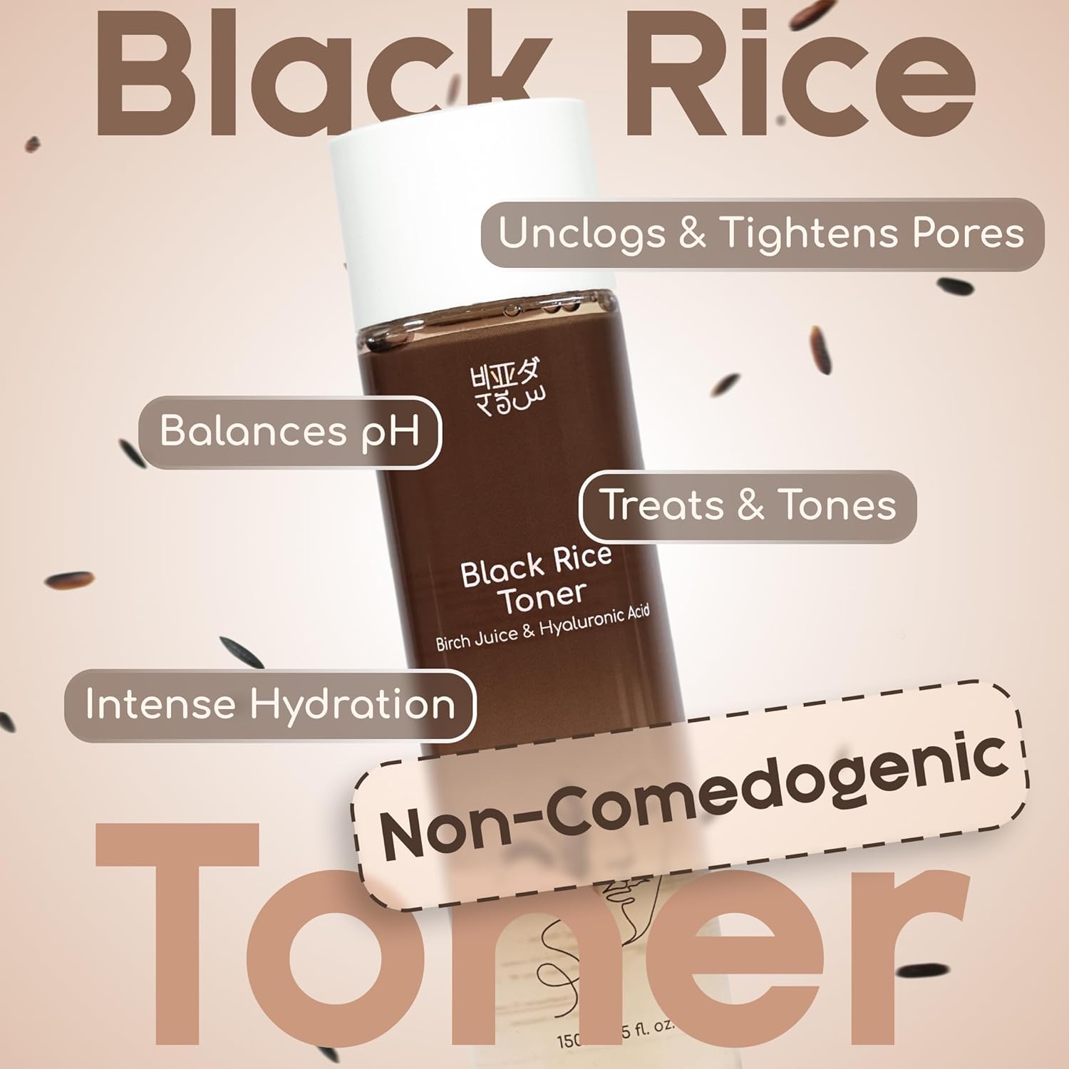 Our Black Rice Toner contains Birch juice, Hyaluronic acid, and Pentylene glycol for soft and supple skin.