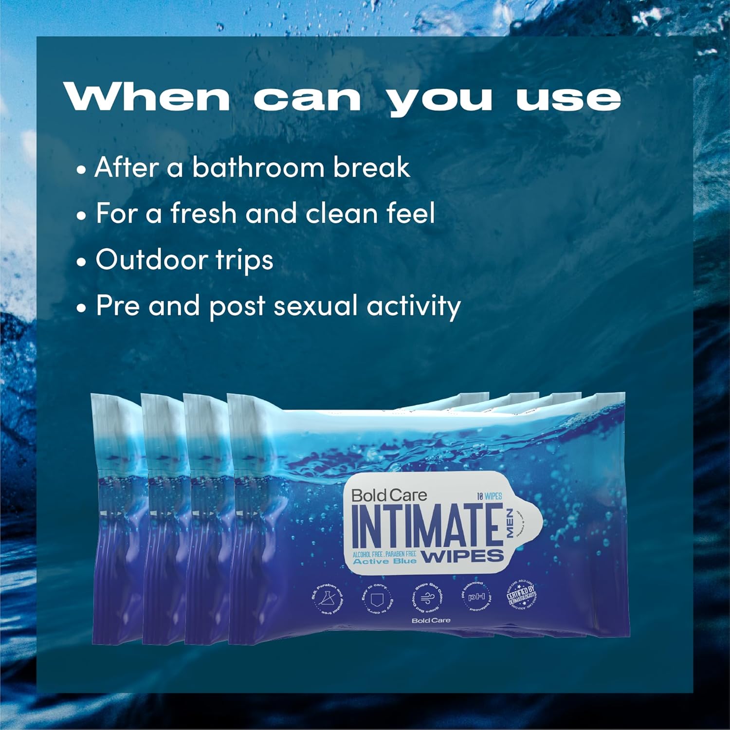 NATURAL, HIGH-QUALITY INGREDIENTS: Forumlated with body-safe ingredients, Active Blue intimate wipes is enriched with high-quality, natural ingredients to prevent itchiness, dryness, and irritation in the intimate area. These clean and chemical-free formula wipes are the modern Indian man’s best friend.
