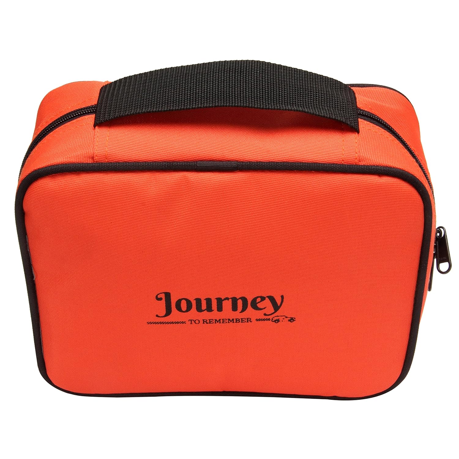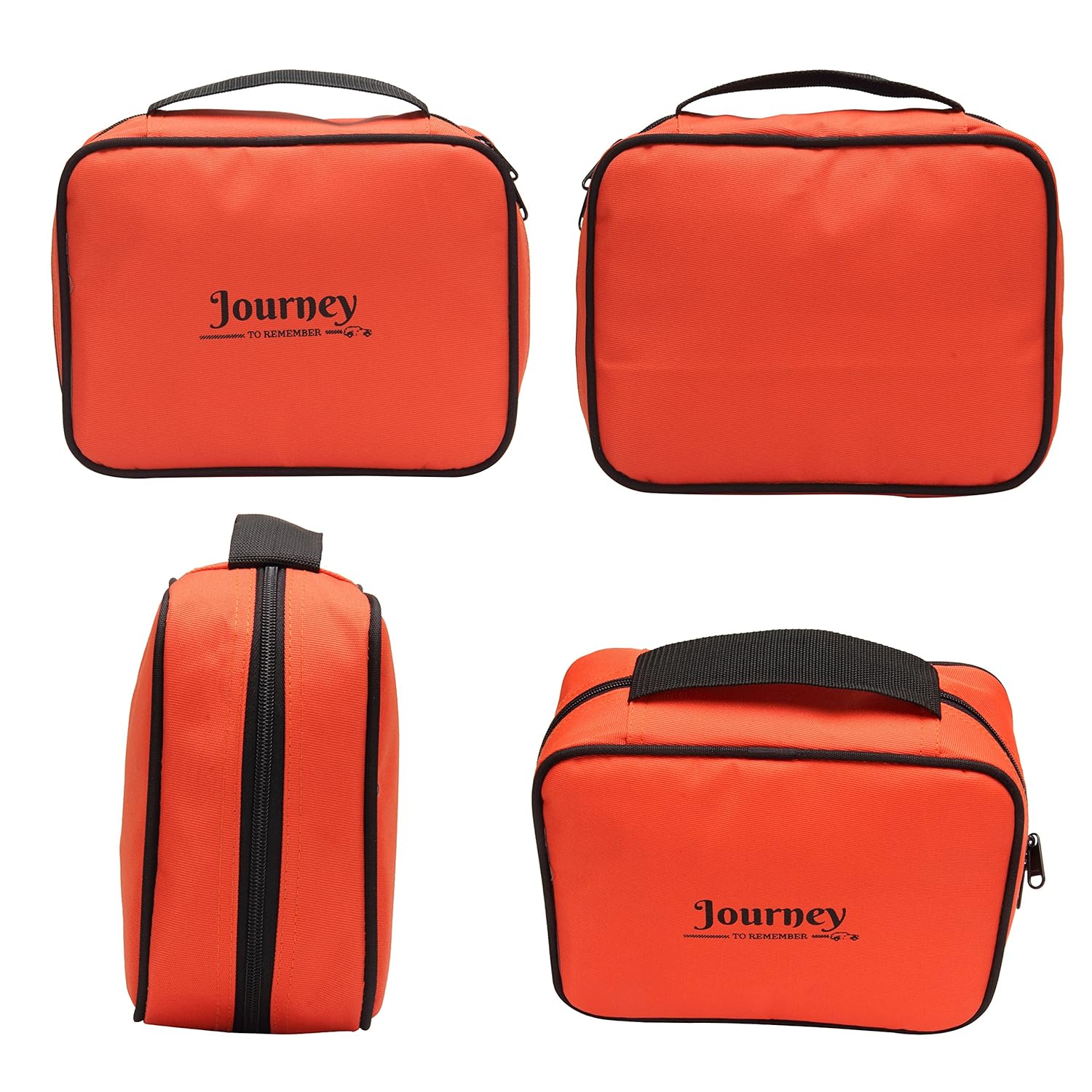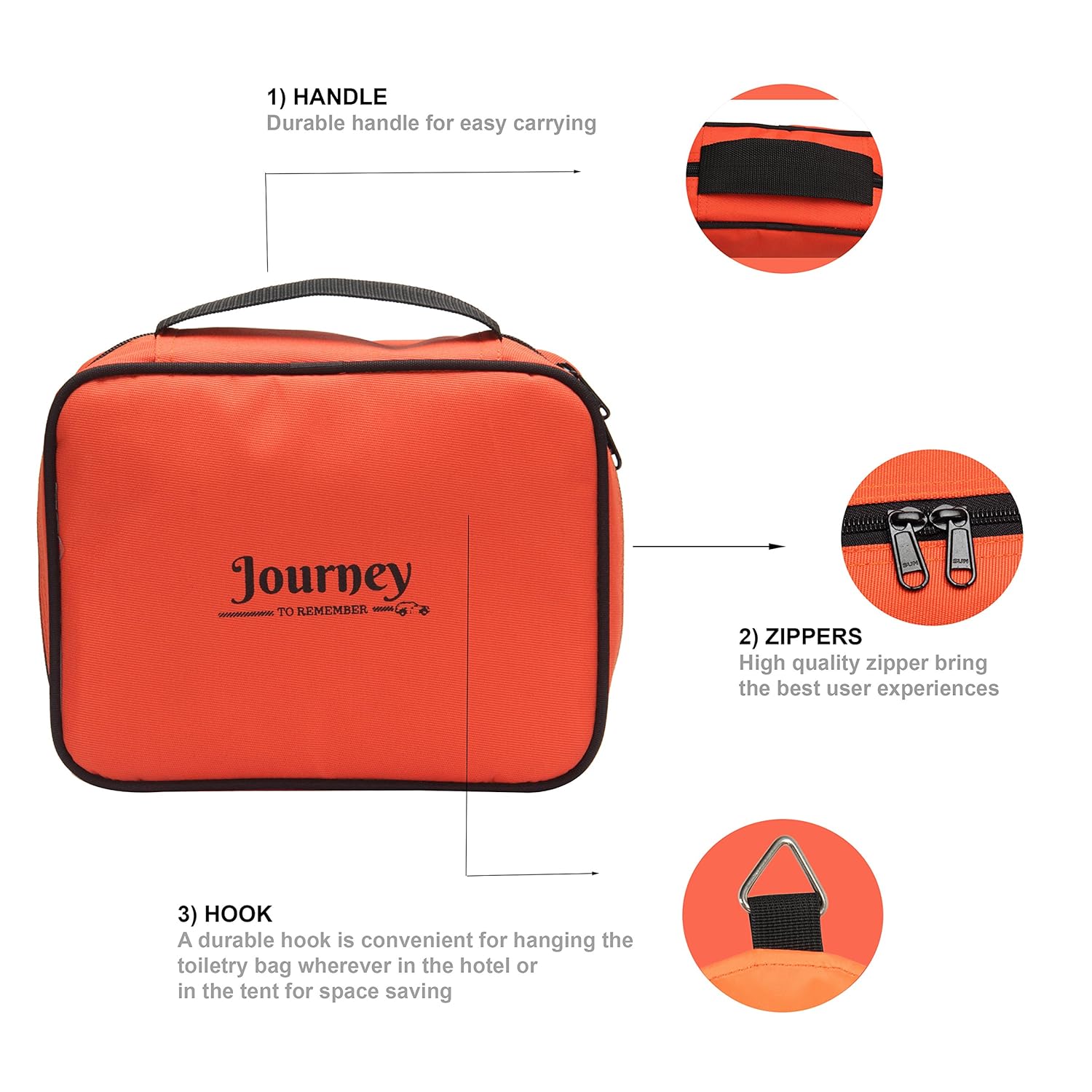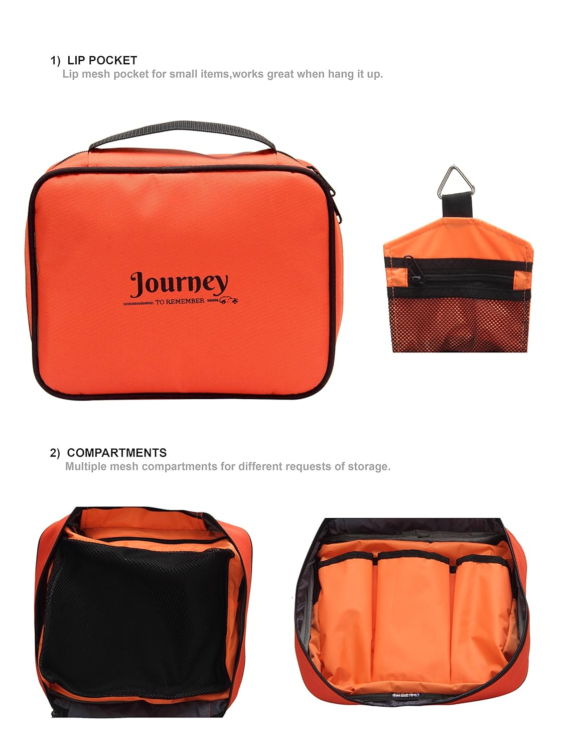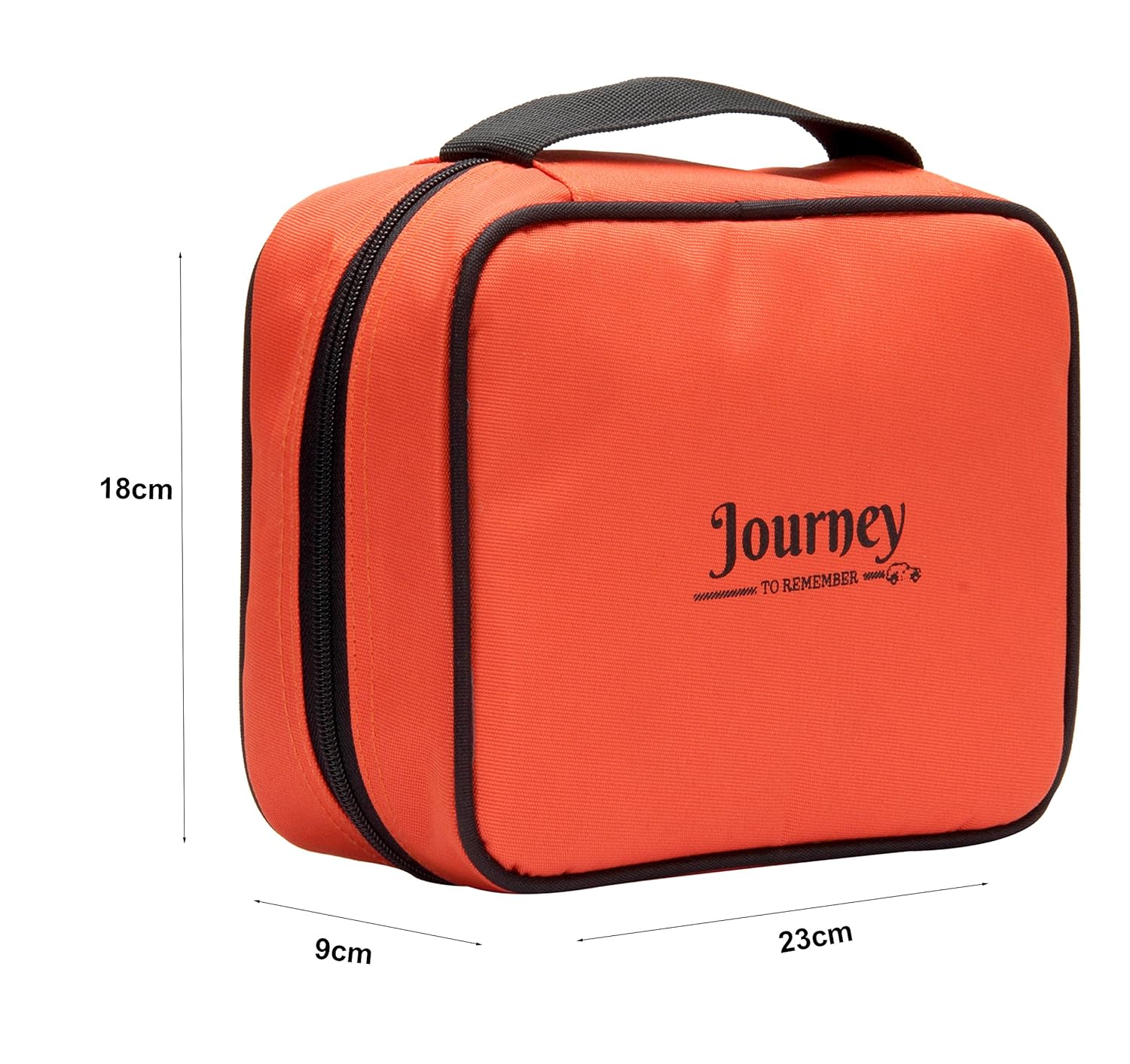 VERSATILE (KEEP THINGS ORGANIZED) – 1. The Top smaller pouch with zip to carry Keys, Rings, Watches etc for easy remembrance 2. The Roomy Mesh compartment to carry Cosmetics, Toiletries and easy visibility 3. The second main compartment behind the pouches can carry wet wipes, sanitary pad etc. 4. Three front pouches can carry Tooth Brush, tongue cleaner, Razor etc 5. Top steel ring can be used to hang the bag on Walls or Hangers behind the door