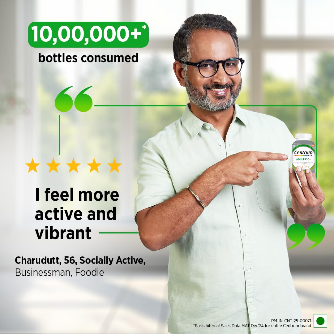 Centrum is World’s no. 1 Multivitamin and Multimineral brand that is present globally across 7 continents and is now in India. Getting older doesn’t mean you have to slow down, but it may mean you need to adjust your nutrient levels to respond to your body’s changing needs. Centrum Adult 50+ Multivitamin & Multimineral Supplement is a daily nutritional supplement, to stay active and healthy so you can feel confident that your body can keep up with your life. Centrum formulations have been tailormade for Indian diets & body needs. It’s comprehensive formula with 23 vital nutrients that ensures over all health. Vitamin C and Zinc enhances Immunity. Vitamin C, Vitamin E and B Vitamins for Healthy Heart, and a Botanical Blend of Boswellia Serrata with Calcium & Vitamin D to ensure healthy functioning Joints. Centrum Tablets are 100% vegetarian & suitable to consume for Vegans as well. These are Gluten free tablets with Non GMO. Don’t worry, they are non habit forming. Centrum Multivitamin supplements are manufactured in a FSSAI certified facility that is GMP certified. Centrum is completely FSSAI complaint. You can refer pack for correct dosage and administration, or can consult your health care practioner. For storage condition please refer the pack.