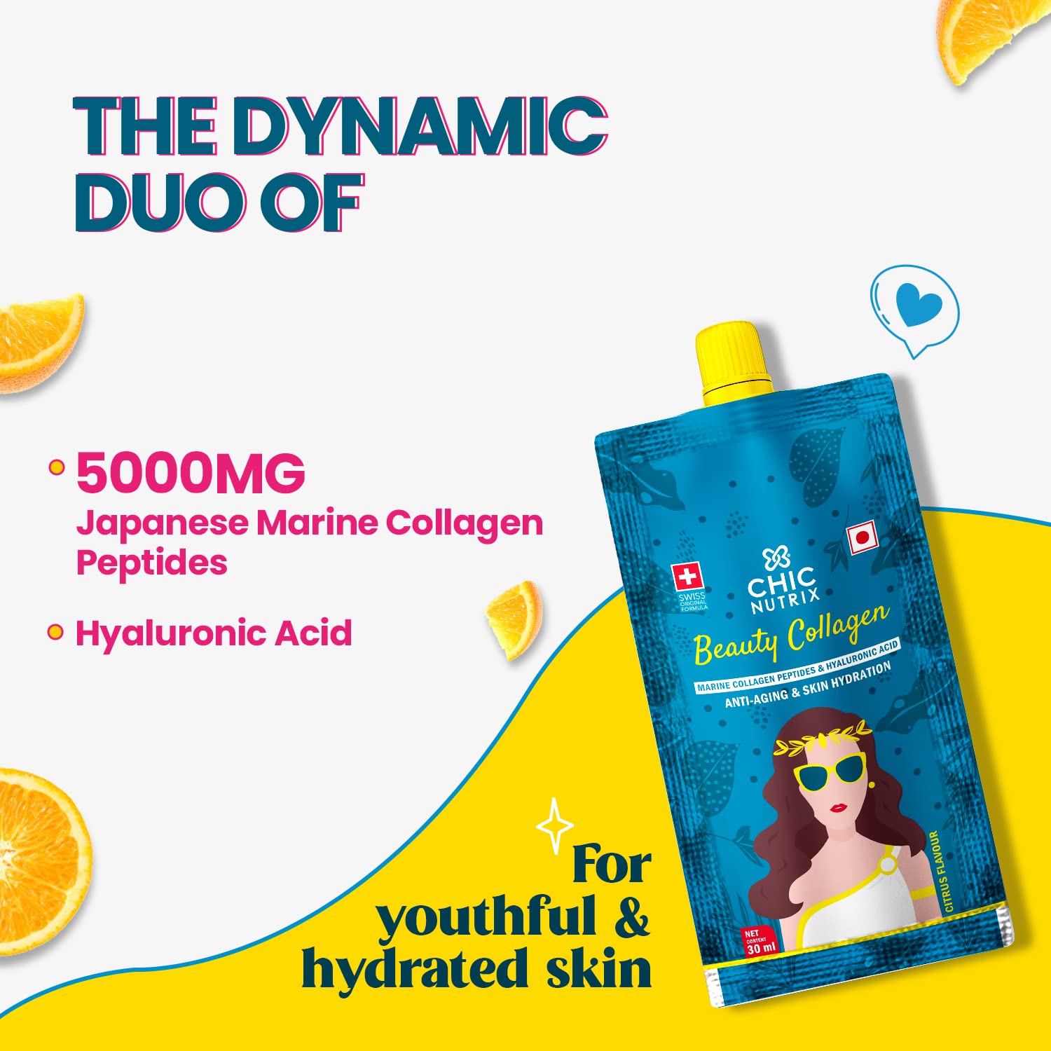 First time in India: unique gel formulation of Japanese Marine Hydrolyzed Collagen and Hyaluronic Acid for youthful and hydrated skin. Skin care supplement that promotes anti-aging, younger looking glowing skin.