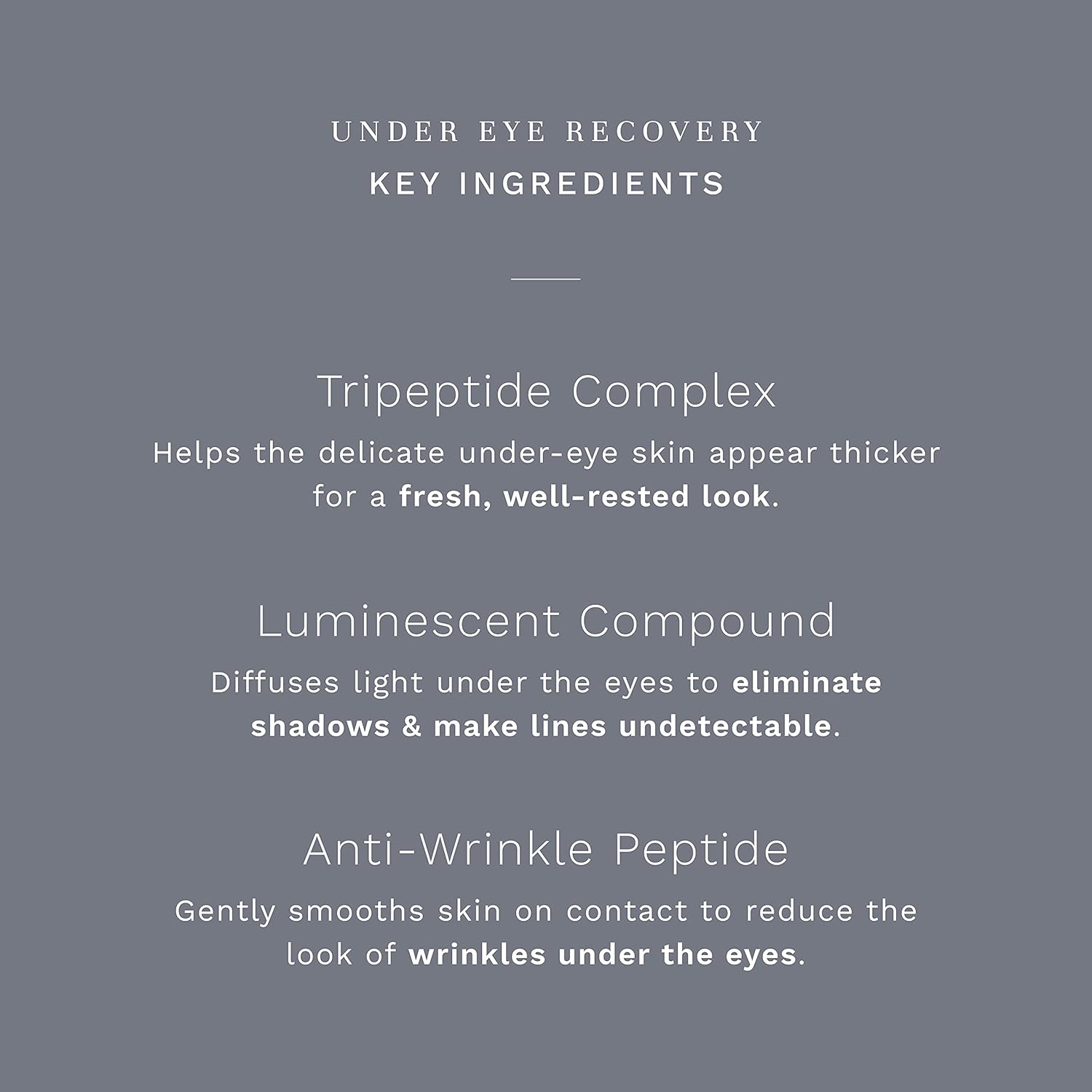 Under Eye Recovery brightens the look of dark circles, while smoothing the appearance of fine lines and puffiness. Using advanced light-scattering optics and collagen-supporting ingredients, this formula instantly brightens to give fragile skin a hydrated, smooth appearance.