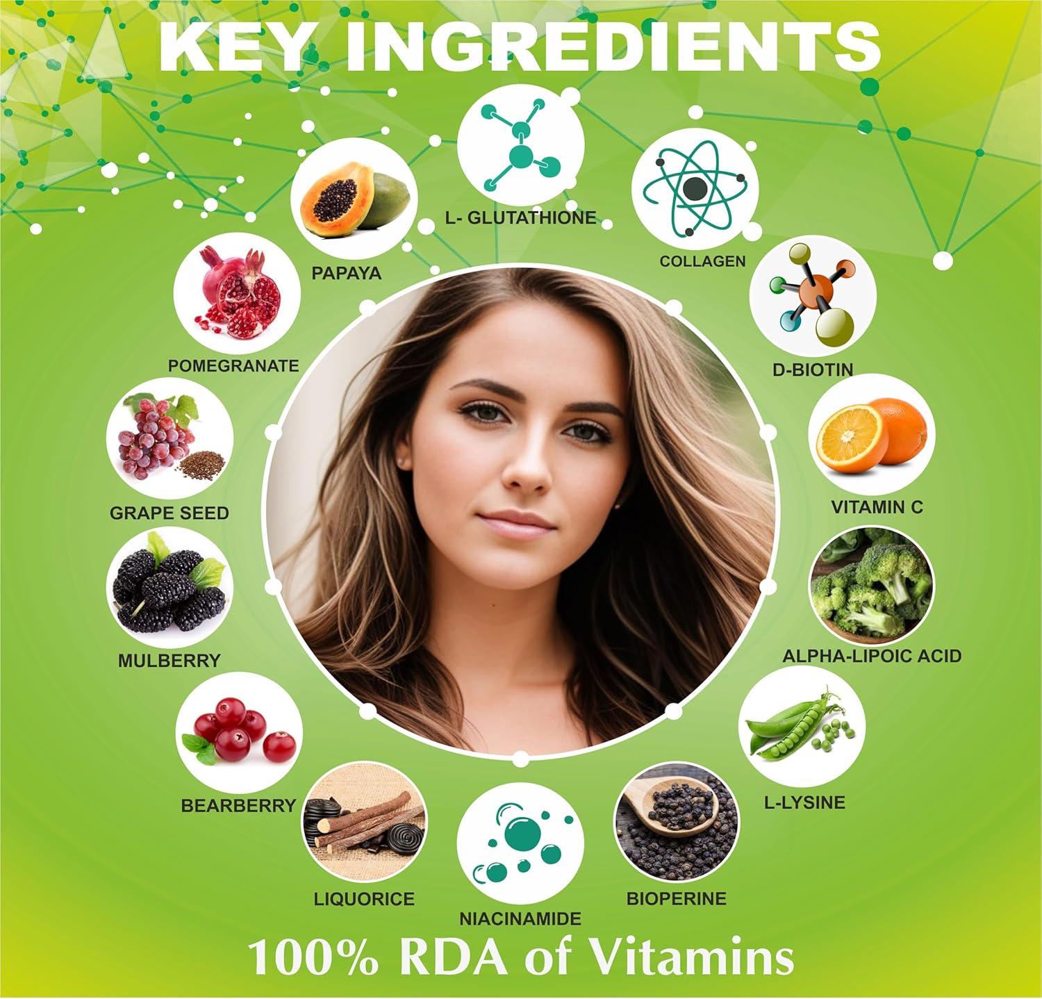 UNIQUE COMBINATION: L-Glutathione, Collagen, D-Biotin, Grape seed extract, Alpha-Lipoic acid, Vitamin C, Vitamin E, Vitamin B3, Papaya extract, Bioperine L-lysine, Liquorice extract, Bearberry extract, Mulberry extract, Pomegranate extract etc. All the ingredients are of highest quality sourced from authentic and certified suppliers.