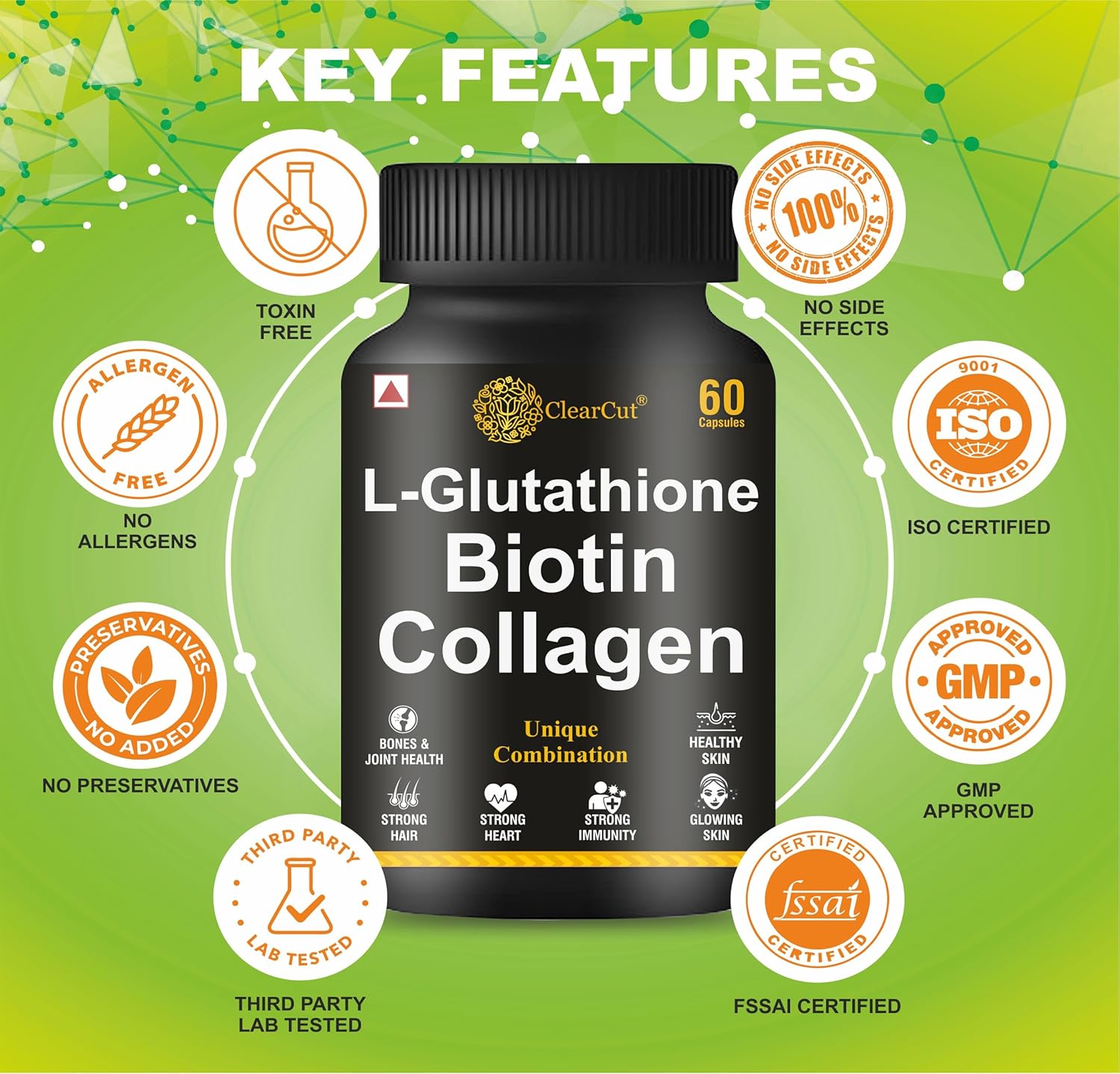 L-GLUTATHIONE (Reduced): Helps in Skin brightening D-BIOTIN- It’s active form of Biotin which helps hair health, makes hair, nails & skin shiny and stronger. COLLAGEN- Helps joints and muscles.