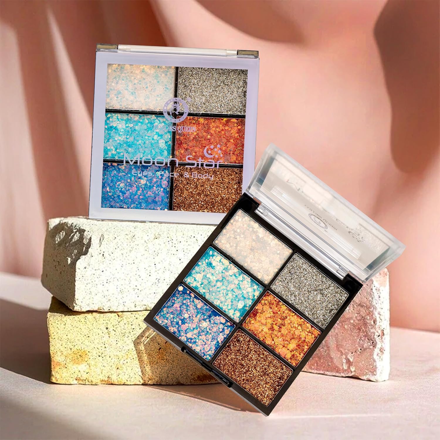 COLORS QUEEN Moon Star 6 Color Glitter Eyeshadow Palette Shimmery Finish Highly Sparkle Glitter Eyeshadow Palette Long Lasting Eye Makeup Palette (Shade-02), Assorted