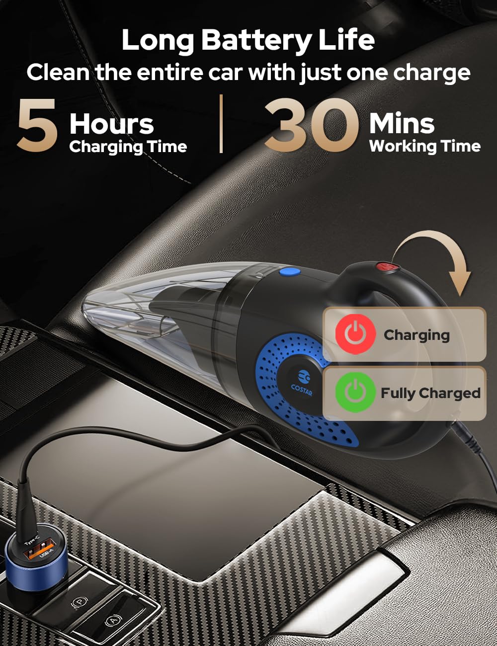 {Cordless Convenience}:Embrace the freedom of cleaning without the hassle of cords with our cordless vacuum cleaner for car. This sleek and modern device offers the flexibility to clean any area of your home without being tethered to a power outlet, providing a hassle-free cleaning solution for busy households.