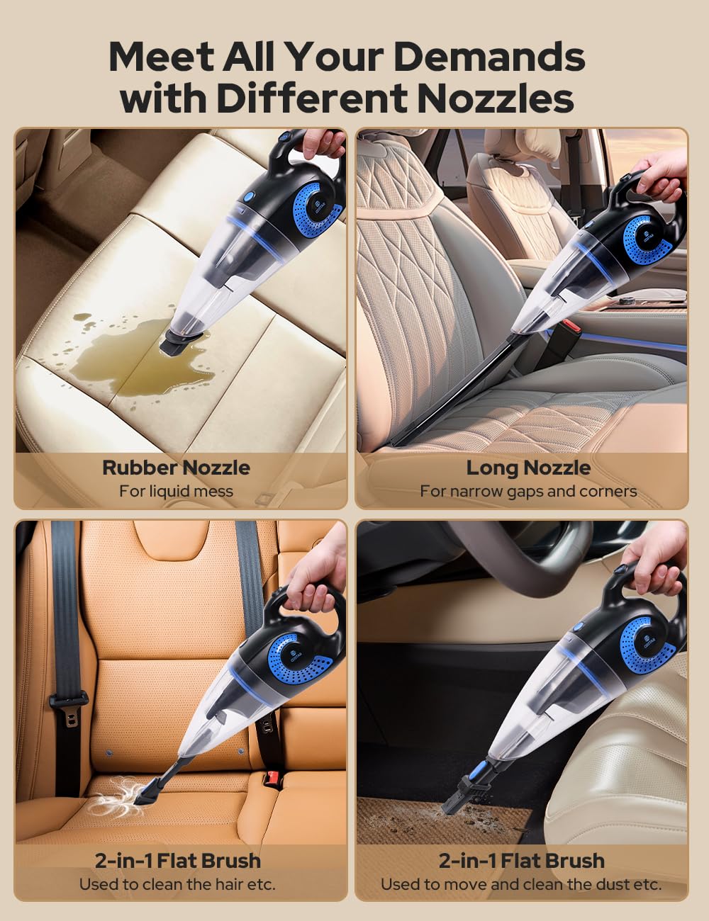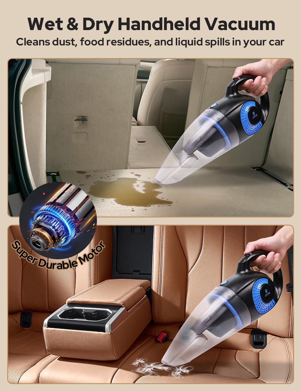 {Superior Motor}: Equipped with a high quality motor, our portable vacuum cleaner for car wireless can tackle both wet and dry cleaning tasks with ease. This makes it a reliable choice for households that require a robust cleaning solution.