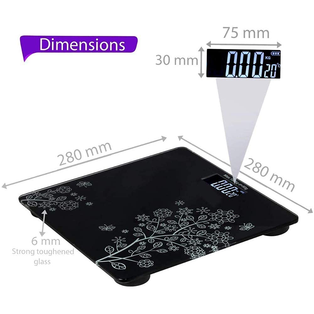 Electronic thick tempered LCD glass weighing scale Measurments : 2 high precision weight sensors provide accurate measurements down to 0.1 kg. Additionally, weighing scale comes with 2 free AA.A batteries with anti skid padding.