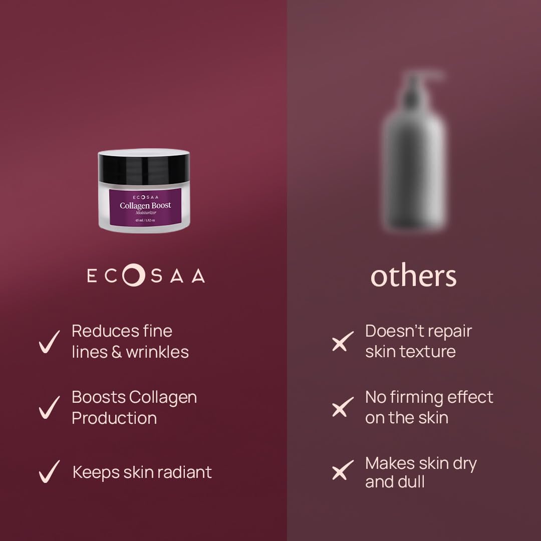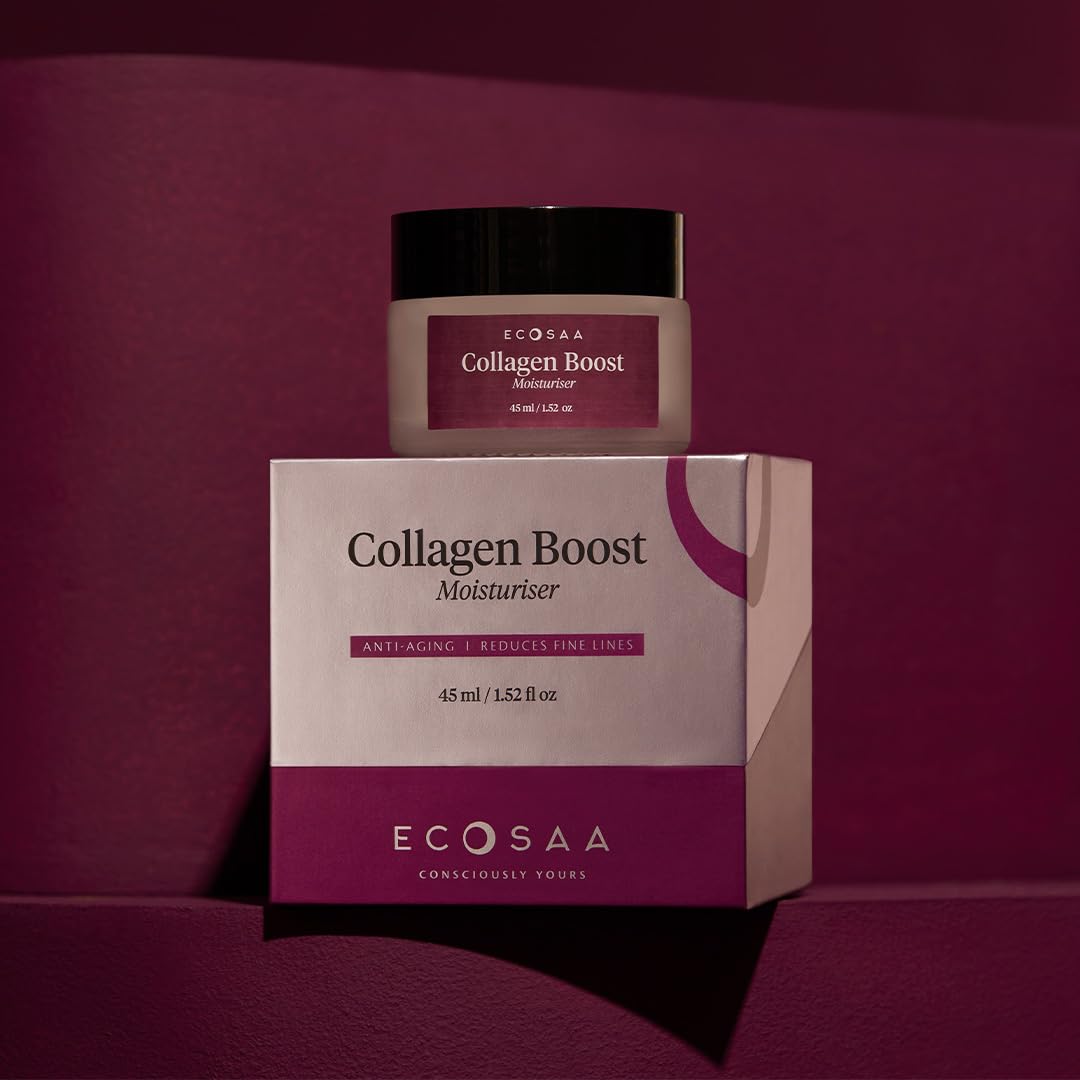 Moisturizer to Reduces Wrinkles & Fine Lines: Ecosaa Collagen Boost Cream Moisturiser targets wrinkles and fine lines, helping to visibly smooth the skin. The combination of collagen, Kakadu Plum, and Vitamin C enhances skin texture, reducing the visibility of ageing signs.