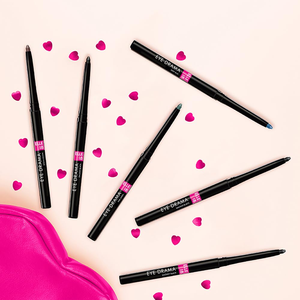 Dramatic Eyes All Day Long The one-stroke kajal that goes well with all your dramas, the Elle 18 Eye Drama Kajal.Intense-colored-kohled eyes, that last for 20 hours straight! A gorgeous formula that’s water-proof, smudge-proof and basically everyday-proof.The looks you carry oh-so-effortlessly, you apply effortlessly too. The Elle 18 Eye Drama Kajal’s is so smooth to use, it just hits different. Which makes it the perfect partner for all your experiments with 4 new colors. Let’s day dream about all the looks you can create with this kajal. It’s water-proof which makes it perfect for that movie night look. It’s range of colors can make your eyes talk at all those college party’s. And it’s smudge-proof which also makes it pop on your no-makeup makeup look. Elle 18 Eye Drama is gorgeous day in, day out.Here’s how to get the Elle 18 Drama Look: Take your Elle 18 Eye Drama Kajal. Uncap the lid, Twist up and swipe it across your upper-lid or on your water line in one single stroke. That’s it. If you want those eyes to slay more, right where the line of your kajal ends, draw a small thunderbolt – you guessed it – in one single stroke. Let’s just say whatever the ask, the Elle 18 Eye Drama Kajal is always the answer. To get the complete Elle 18 look, check out the Elle 18 Liquid lipstick.