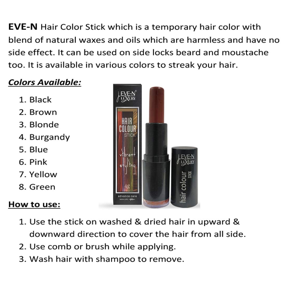EVE-N Hair Touch-Up Color Stick is the ultimate accessory in fashionable looks. Do away with time consuming coloring of hair and rushing to beauty salons when you want to go out and look good. Use the EVE-N Hair Touch-Up Color Stick and apply to roots and strands that you want to touch-up or color temporarily. It’s wonder non-greasy formula ensures your hair does not look or feel greasy. In a convenient easy-to-use lipstick format, you can apply it anytime on the go. Indulge Hair Touch-Up Color Stick is especially effective for blending away gray with its unique non-greasy, non-oily formula. It is compatible with all hair colors. Available in two shades – Black and Brown…