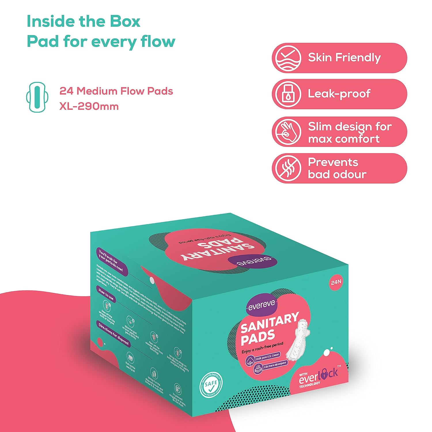Experience a more comfortable period with Evereve 100% pure U.S. Cotton sanitary pads, created to suit your unique needs. The natural, breathable & ultra soft cotton top sheet makes the pads so thin & comfortable you will forget you are wearing one! 1.5x more absorption, super absorbent core,dry top sheet & 7 layers of protection keep you super dry. The wings, long length & wider back further ensure a leak-proof & odour-free experience. Not only that, the pure cotton top sheet & no fragrance ensure you don’t get rashes, dryness or itchiness. Our pads are dermatologically certified to be skin-friendly. They are chlorine-free & fragrance free. Easy to dispose too as they are individually wrapped in disposable bags.This pack contains: 24 Medium flow pads (290mm)