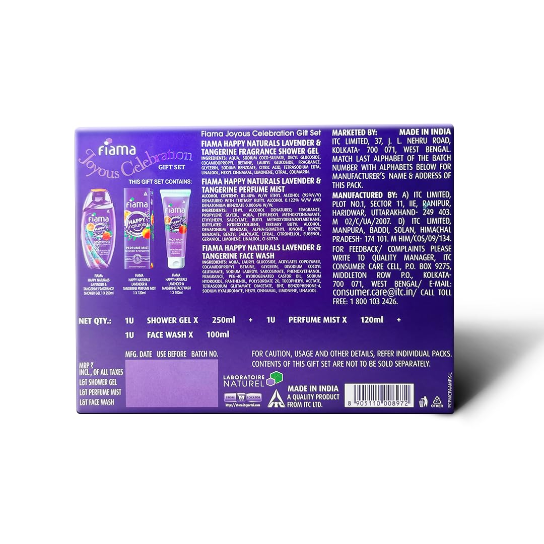 Fiama Joyous Celebation Gift Set | Luxurious Gift Box for Women, Men and Family | Ideal for Rakshabandhan, Diwali, Birthday, Anniversary, Onam, All special Occasions | Pack of 3 | Lavender & Tangerine | Shower Gel, Perfume Spray & Face wash
