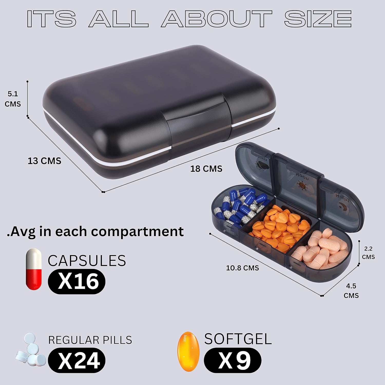 Large Capacity Pill Box: The weekly pill box organizer has 7 separate daily pills organizer for a week, total 21 large compartments. You could plan your daily vitamin plan by one day or by weekly in advance. Plenty of room for all of your meds and keeping yourself organized